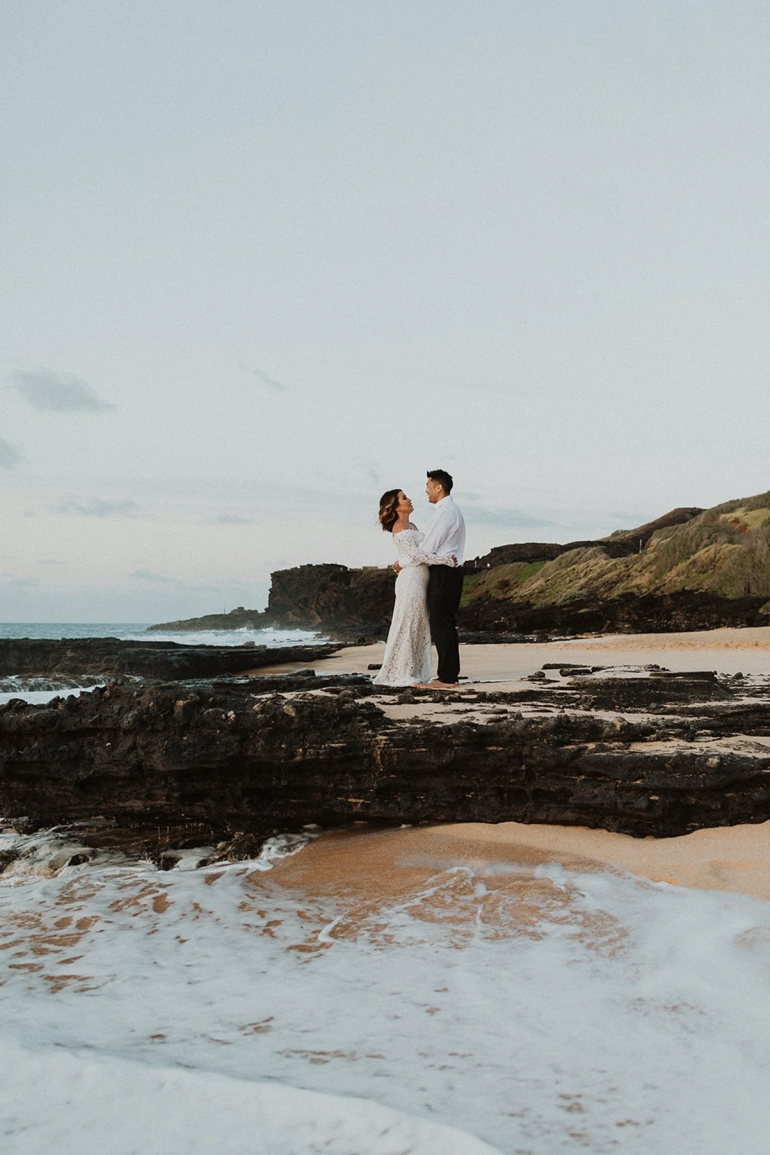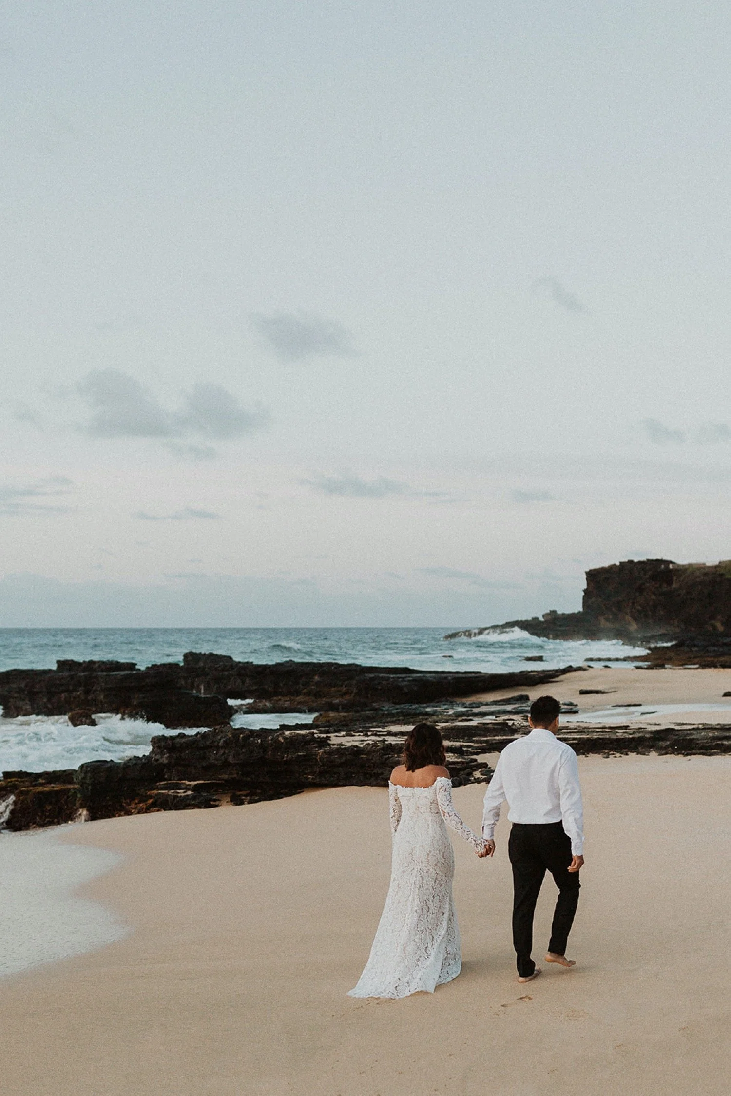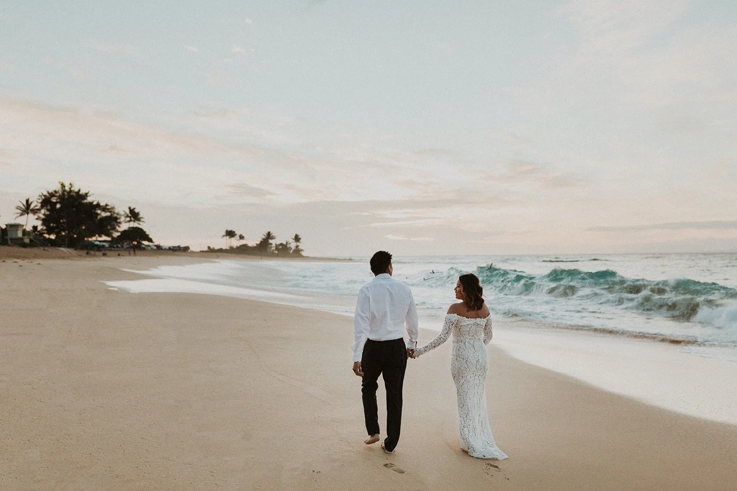 We woke up early in the morning to catch the sunrise in Honolulu, and I met them down on the beach on the East Side of Oahu. We started the day with Bridals. Eric and Thammany put on their wedding attire and they both looked amazing! I loved Thammany’s lace-off-the-shoulder wedding dress with Eric’s simple white button-up! Their beach outfits looked amazing at this beach Bridal photoshoot. We ran around the beach as the sun was rising and we were greeted with the most gorgeous sunrise in Hawaii. Honolulu is by far one of my favorite places to watch the sun come up on Oahu. I just love that crisp morning light.