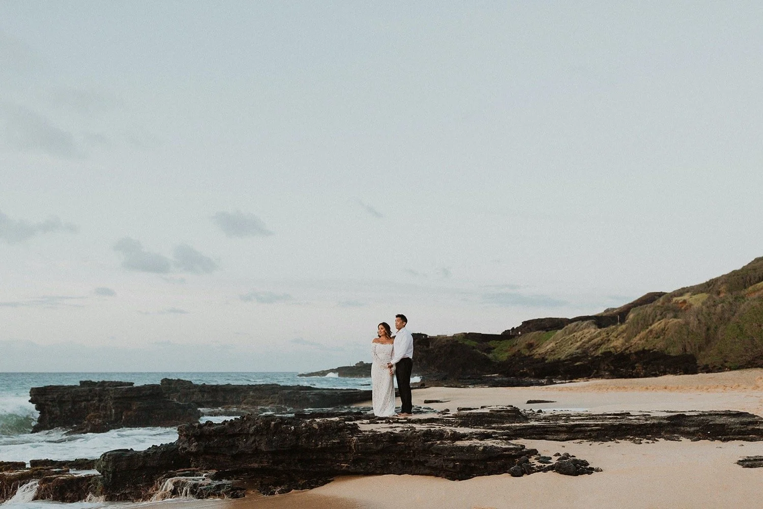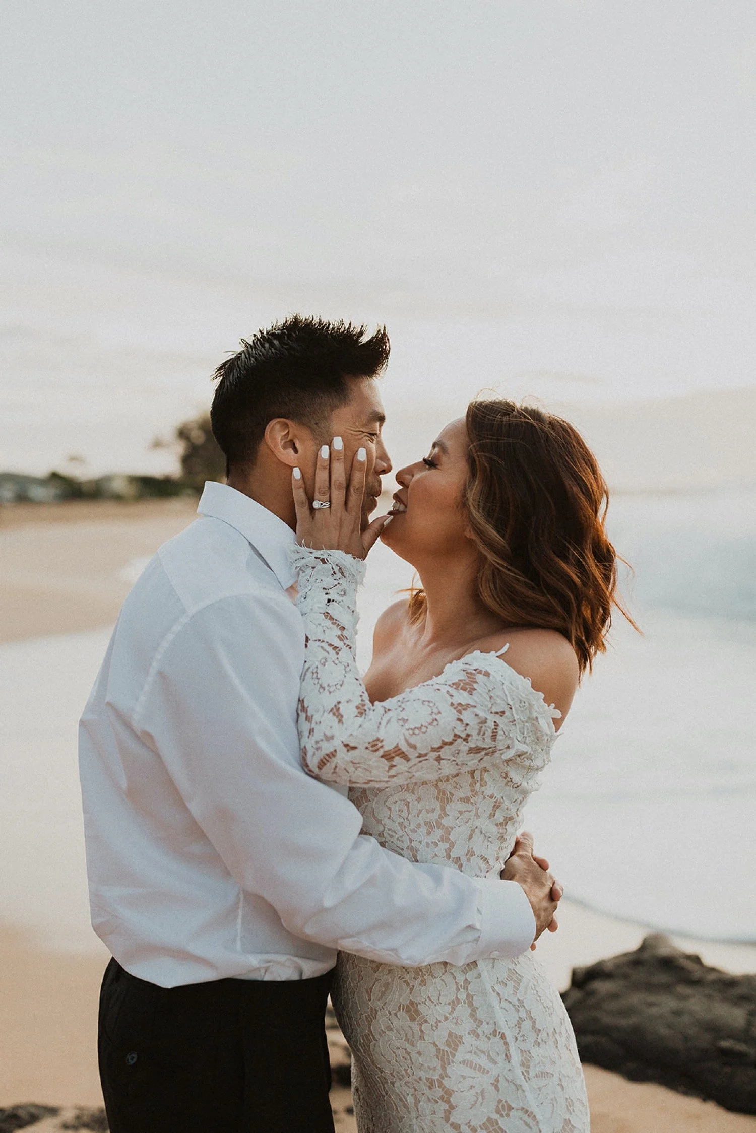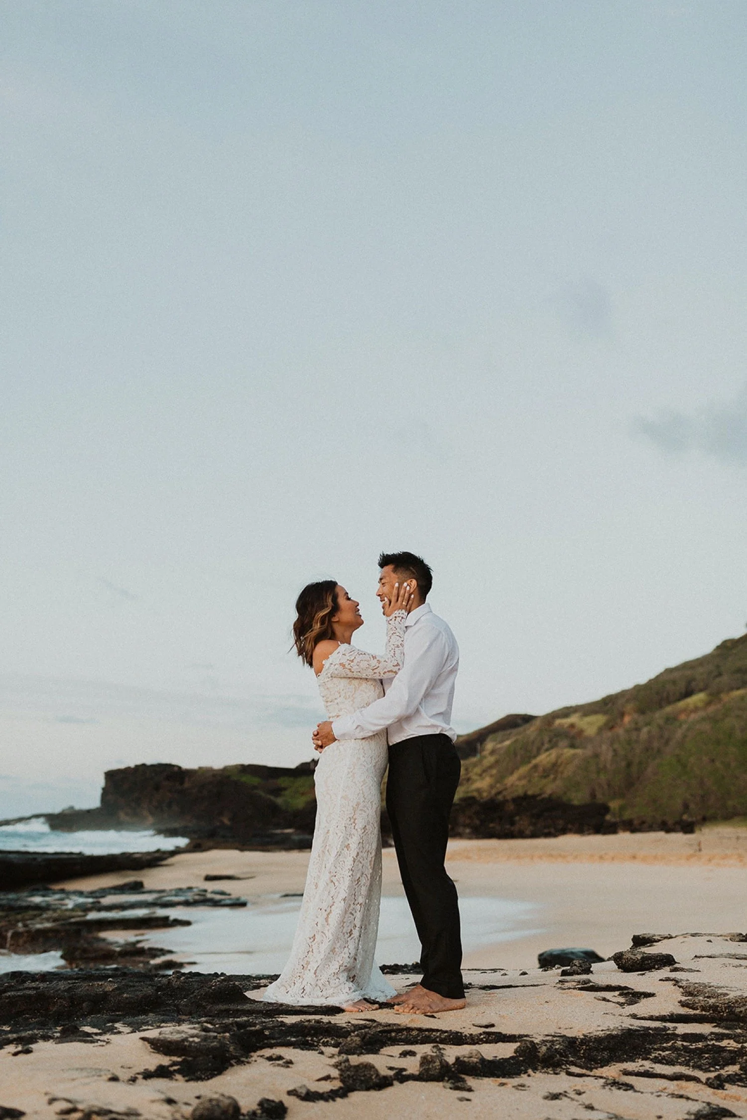 We woke up early in the morning to catch the sunrise in Honolulu, and I met them down on the beach on the East Side of Oahu. We started the day with Bridals. Eric and Thammany put on their wedding attire and they both looked amazing! I loved Thammany’s lace-off-the-shoulder wedding dress with Eric’s simple white button-up! Their beach outfits looked amazing at this beach Bridal photoshoot. We ran around the beach as the sun was rising and we were greeted with the most gorgeous sunrise in Hawaii. Honolulu is by far one of my favorite places to watch the sun come up on Oahu. I just love that crisp morning light.