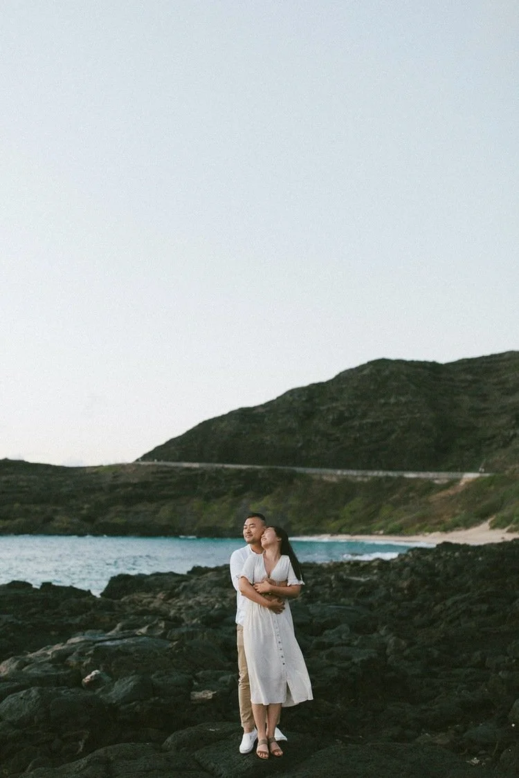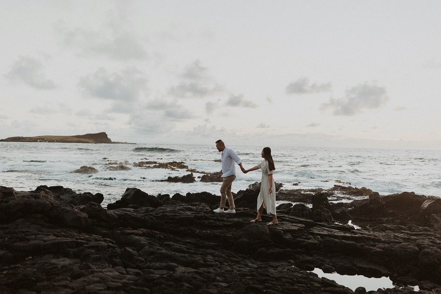 They wanted their shoot to be near the ocean, so I thought of the perfect location! I met with them on the east side of the island in Honolulu. This location is so beautiful with so many unique views. The gorgeous lava rock, front row sunrise views, and huge waves were the perfect backdrop for this sunrise couples session in Hawaii.