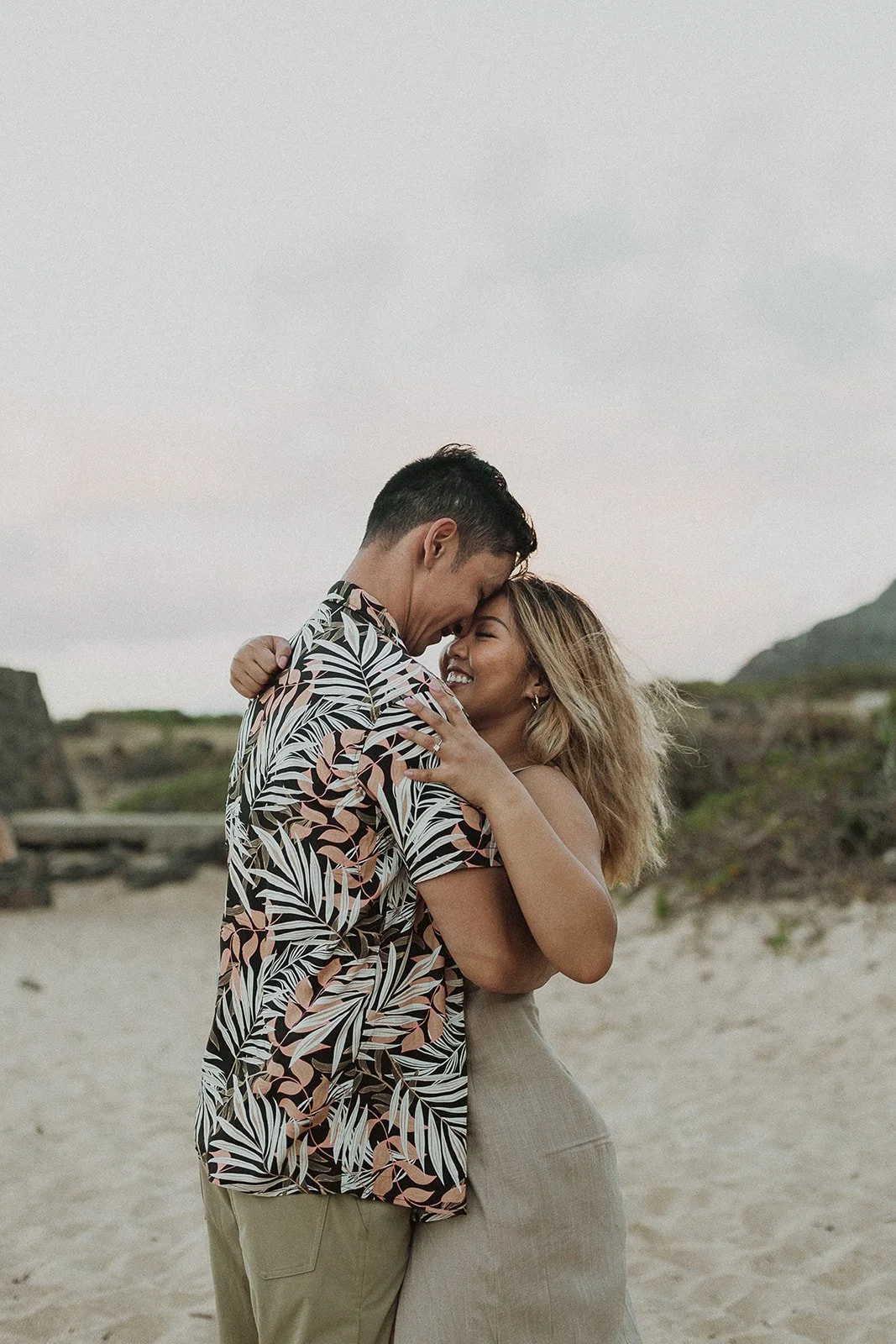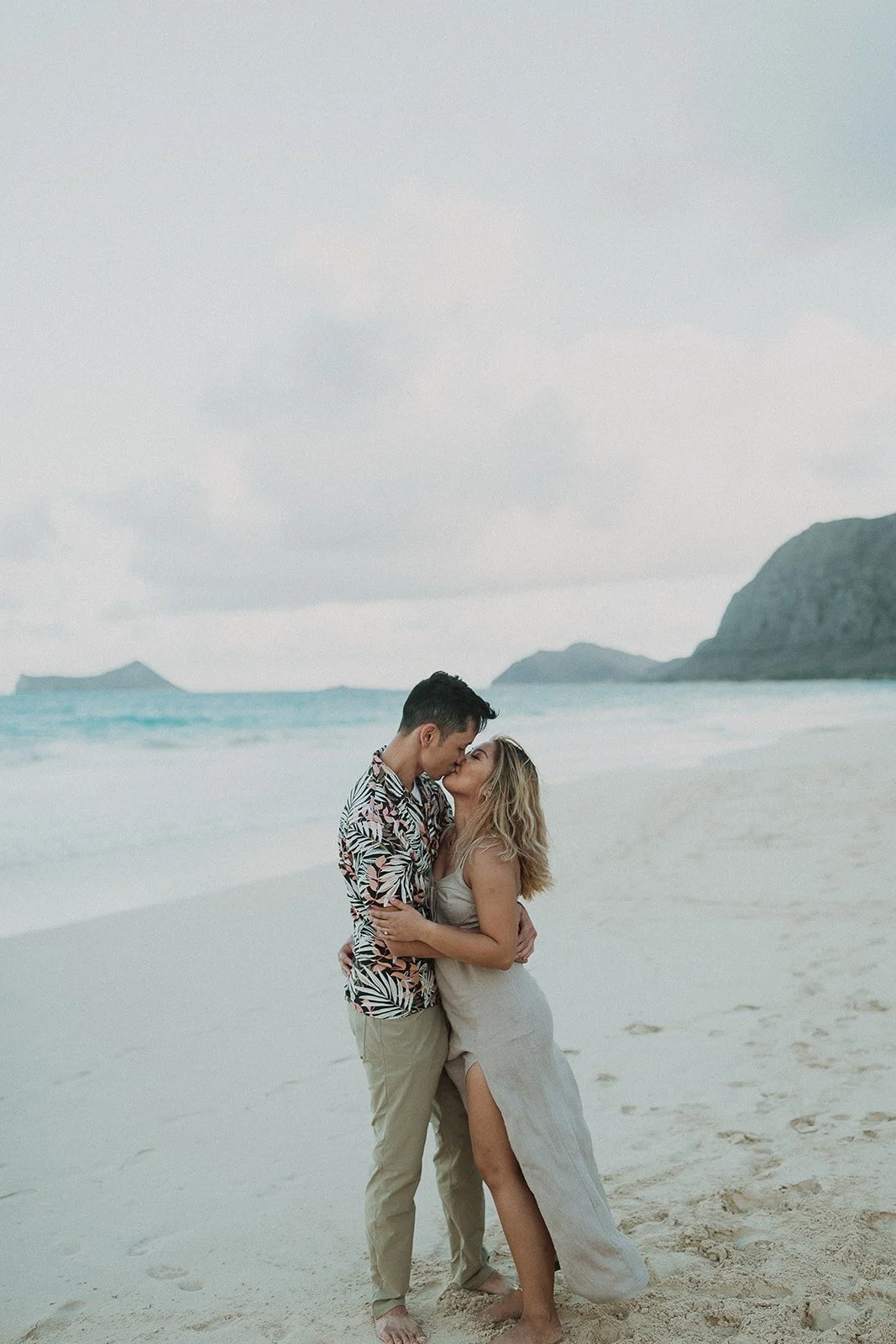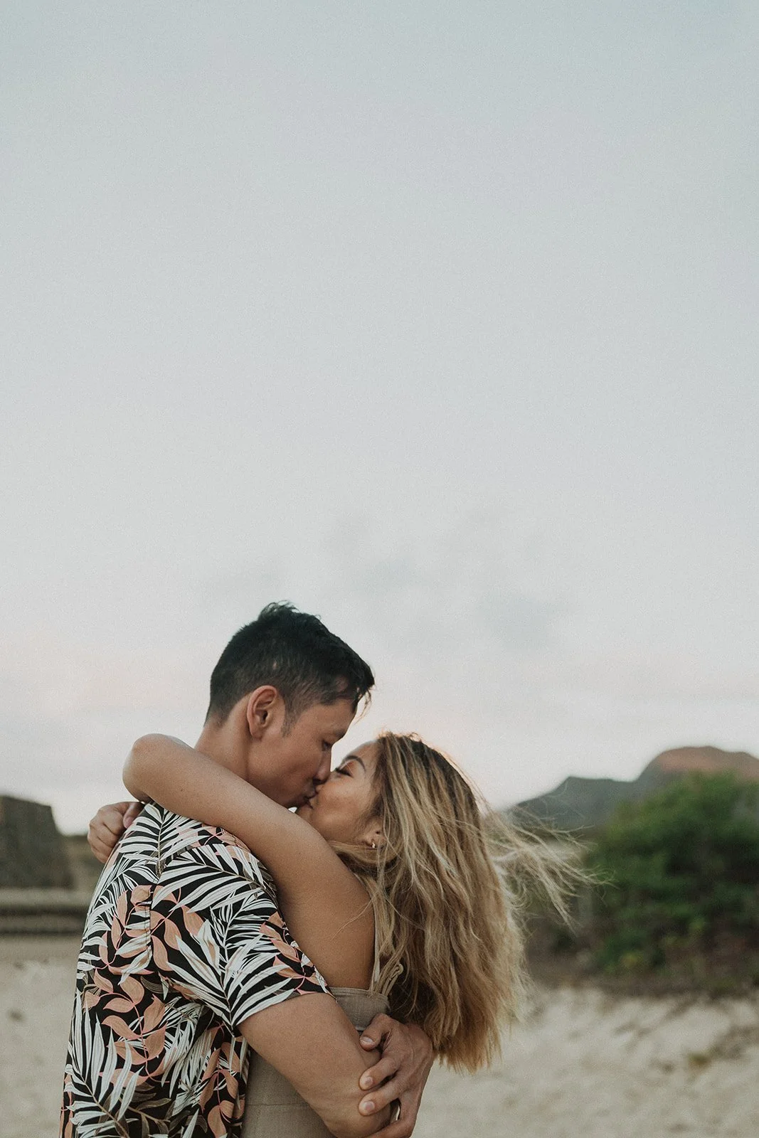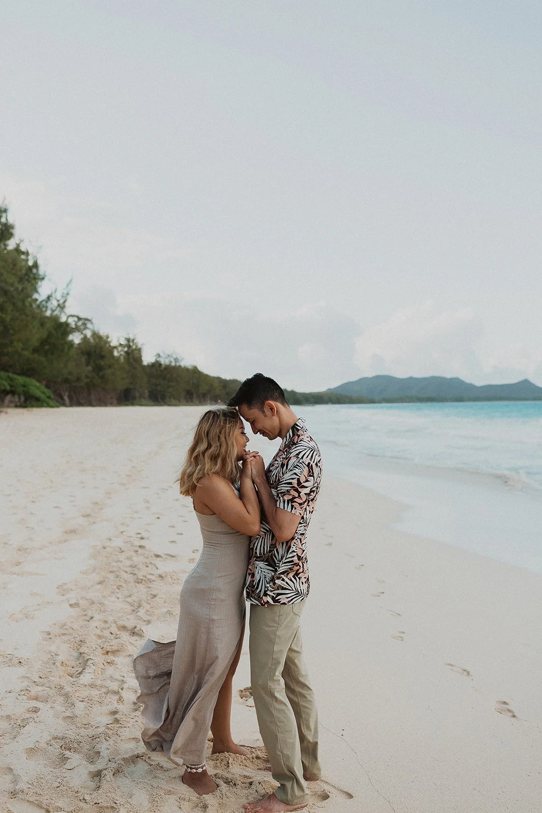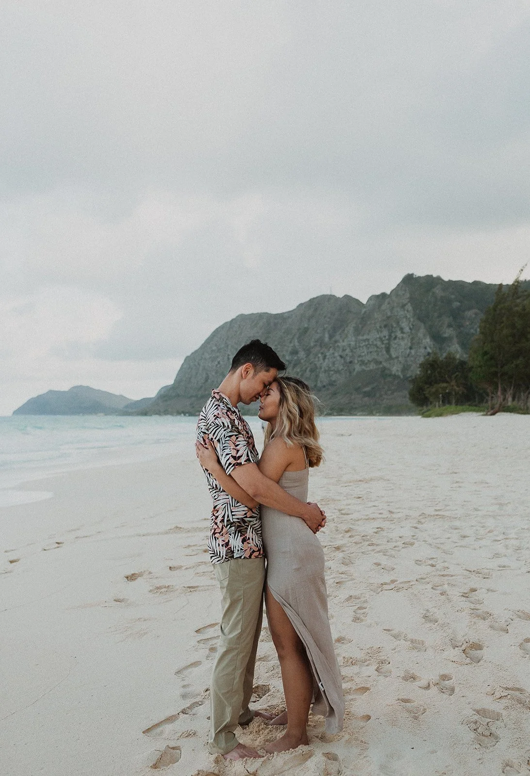 Everything about this romantic beach couples session was so dreamy!! Shooting in Hawaii is always such a treat because the landscape is so diverse and unique – you can get dramatic mountains one second and sweeping coastal beaches the next. For this romantic sunset session, we were able to catch the perfect evening lighting on Oahu’s east side for a dreamy and effortless experience.