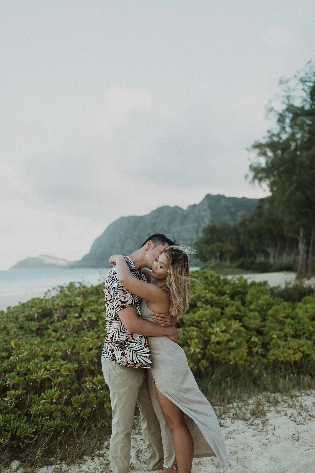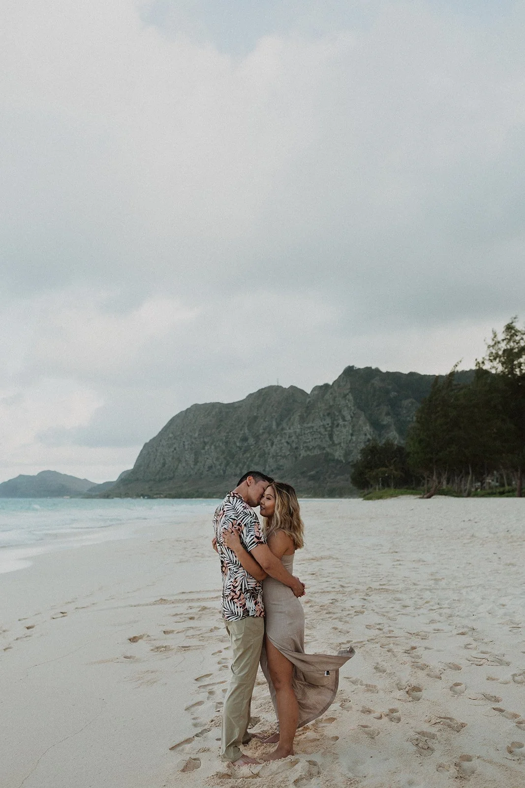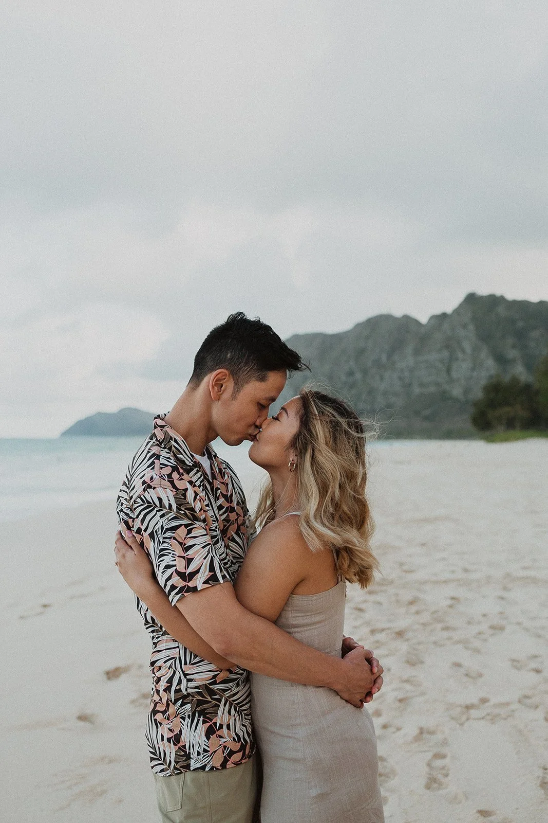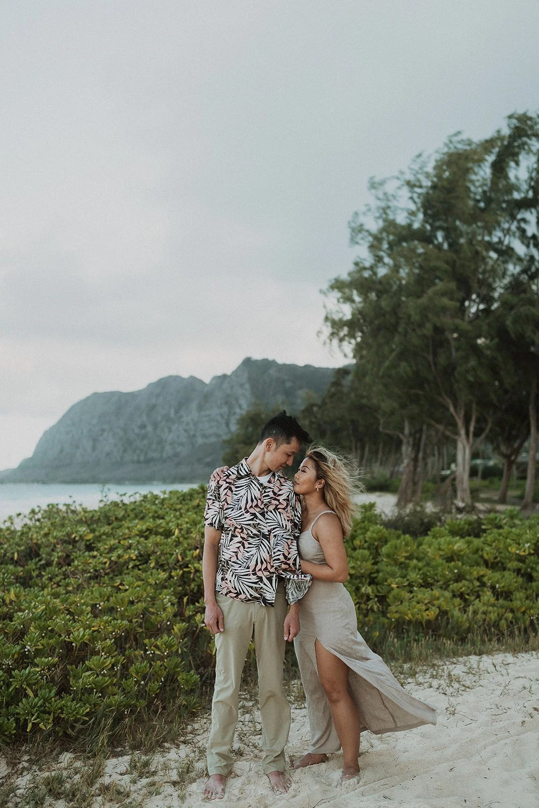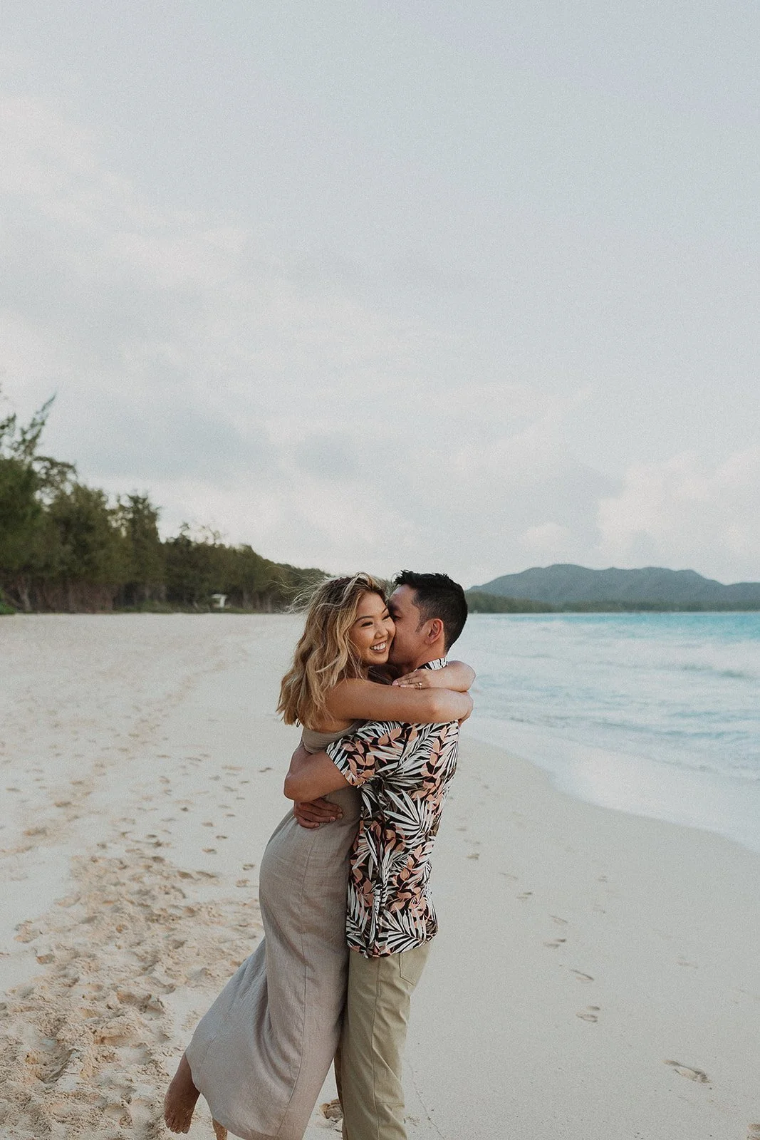 Everything about this romantic beach couples session was so dreamy!! Shooting in Hawaii is always such a treat because the landscape is so diverse and unique – you can get dramatic mountains one second and sweeping coastal beaches the next. For this romantic sunset session, we were able to catch the perfect evening lighting on Oahu’s east side for a dreamy and effortless experience.