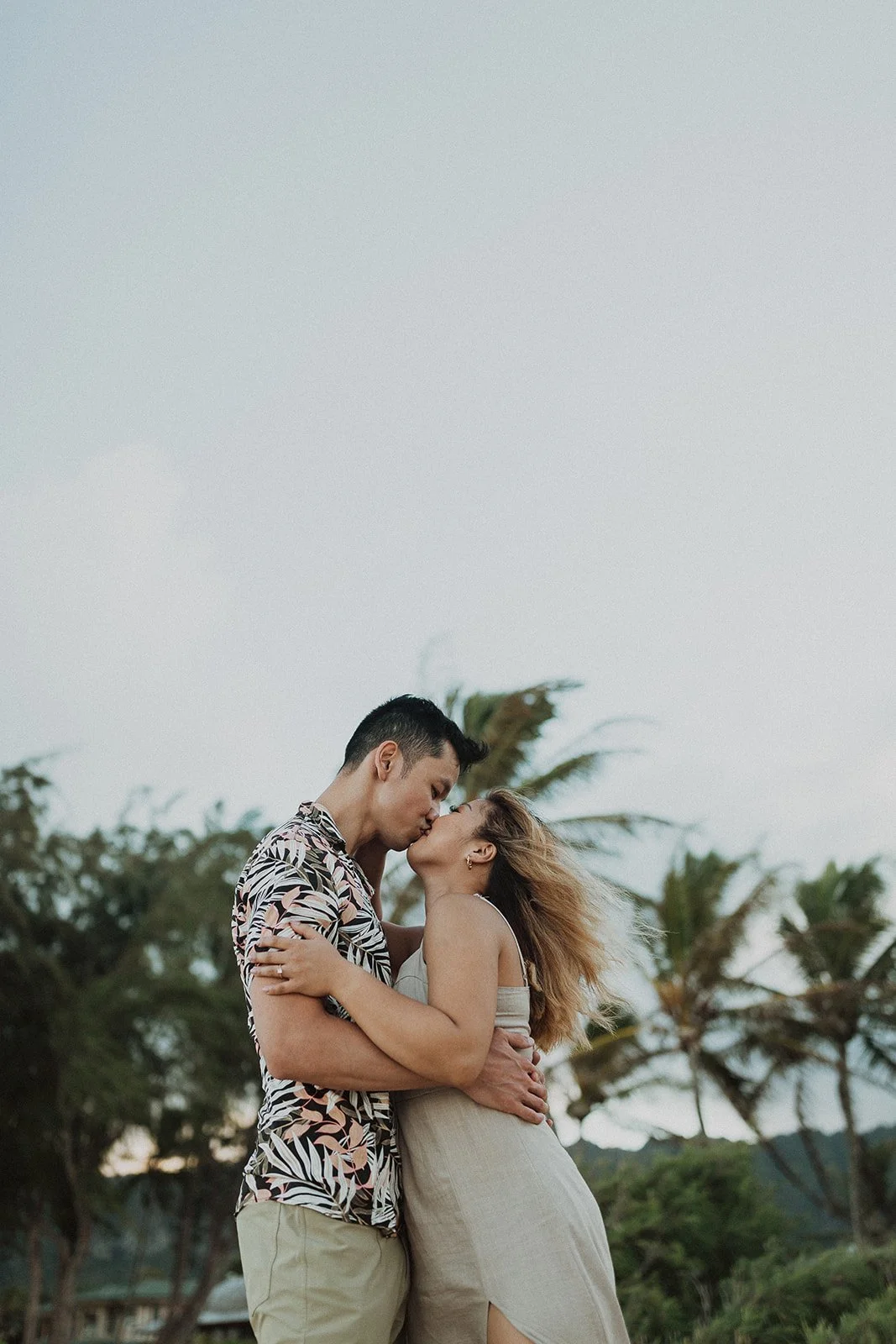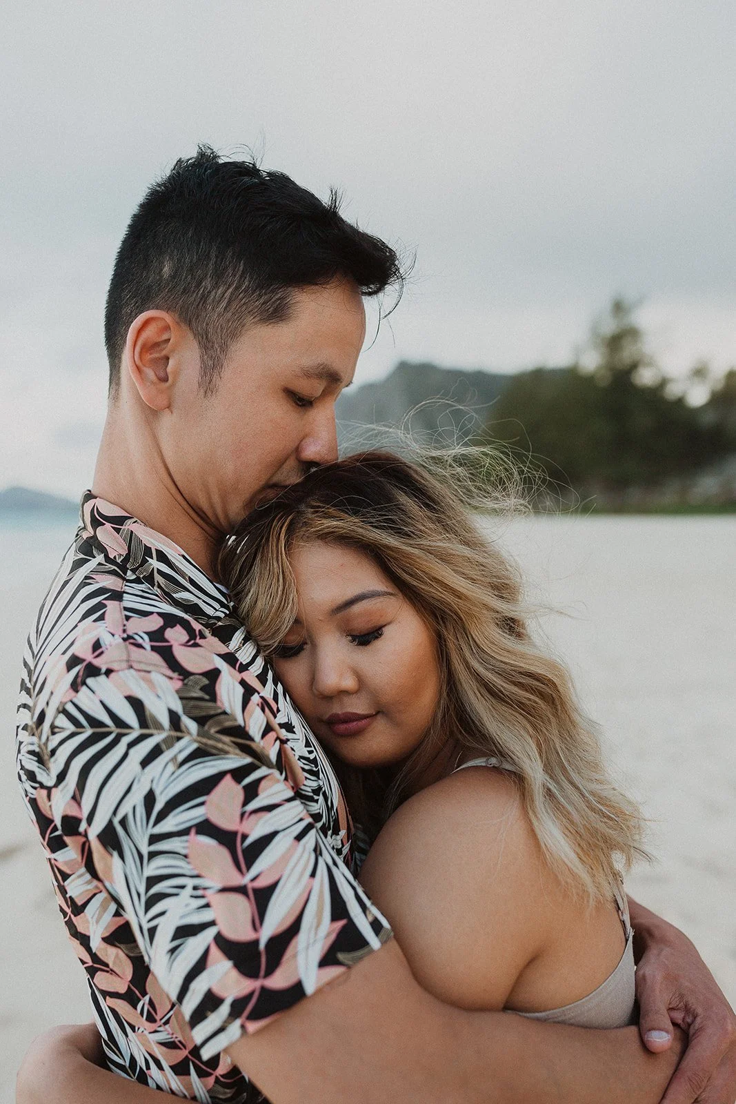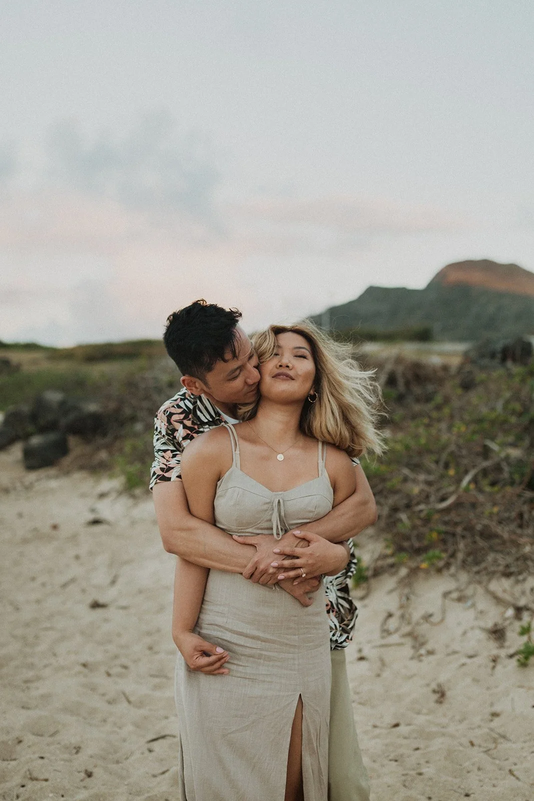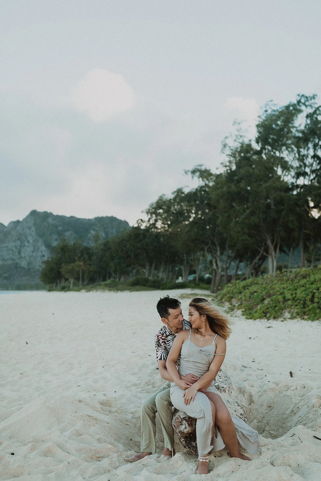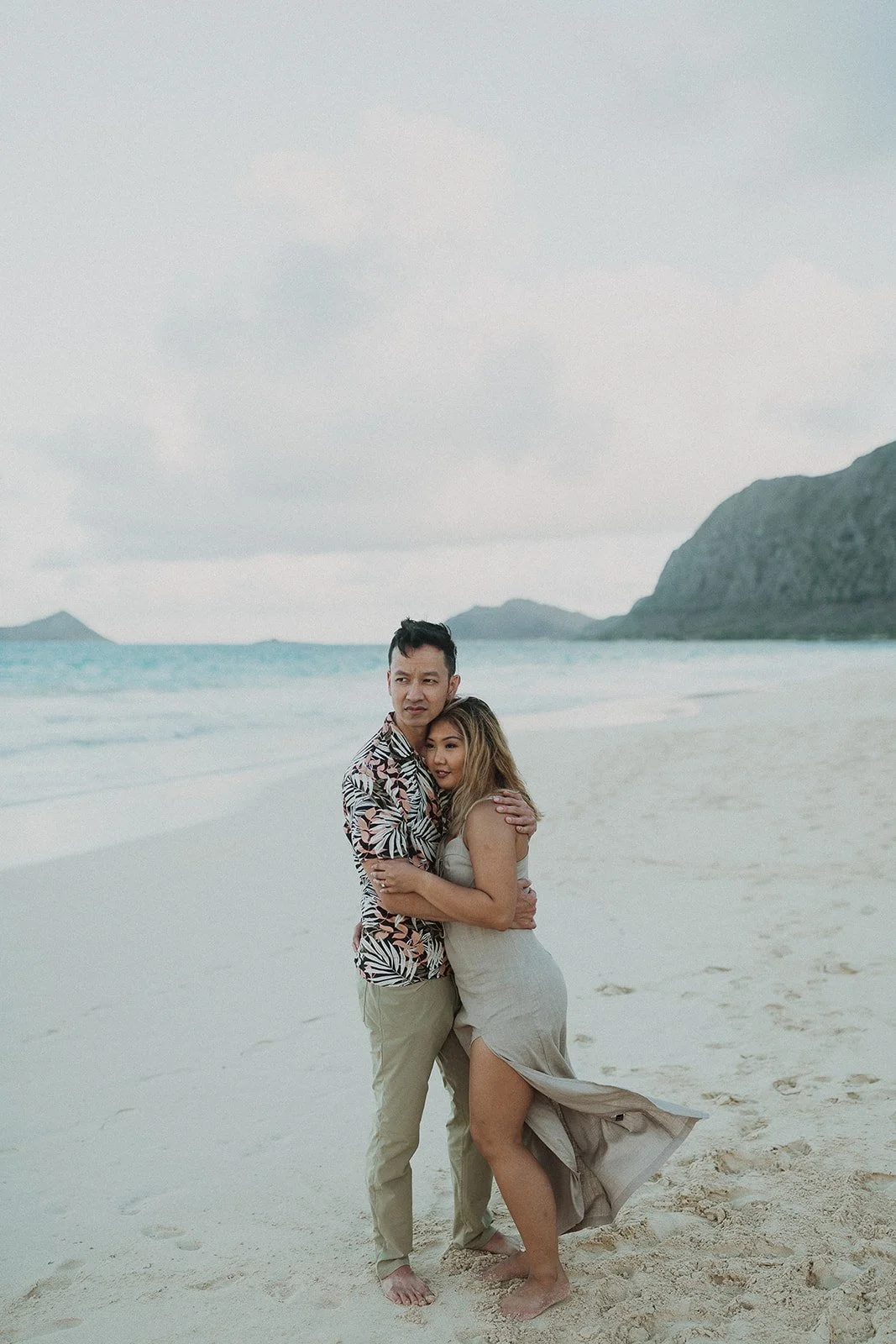 Everything about this romantic beach couples session was so dreamy!! Shooting in Hawaii is always such a treat because the landscape is so diverse and unique – you can get dramatic mountains one second and sweeping coastal beaches the next. For this romantic sunset session, we were able to catch the perfect evening lighting on Oahu’s east side for a dreamy and effortless experience.