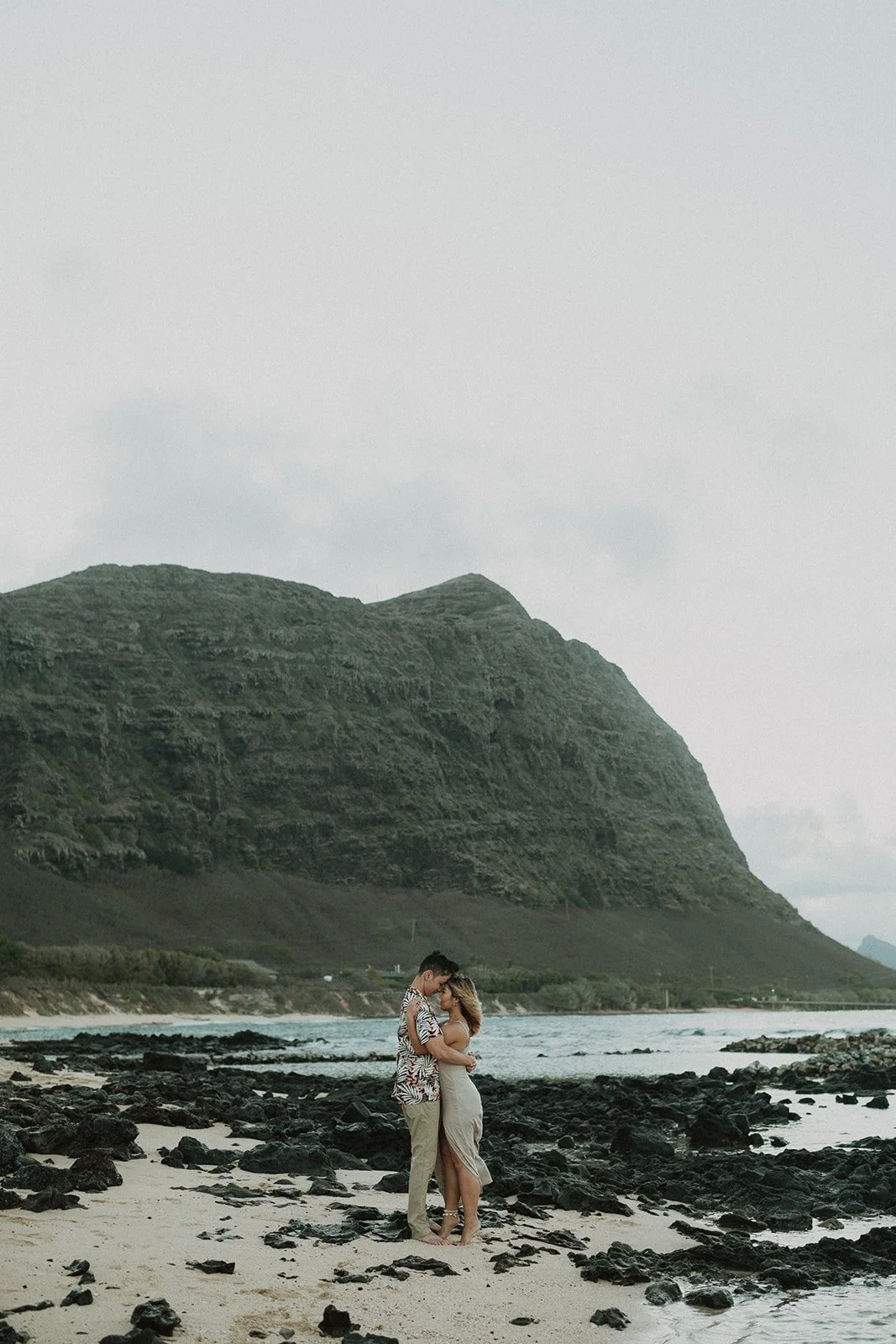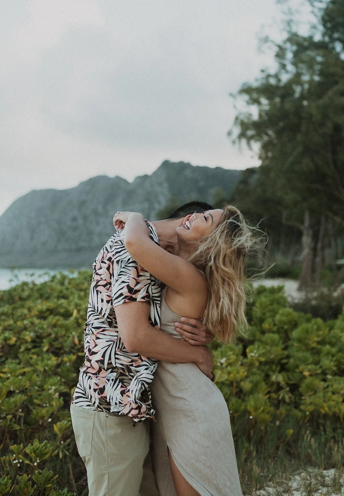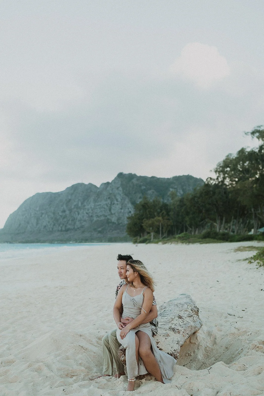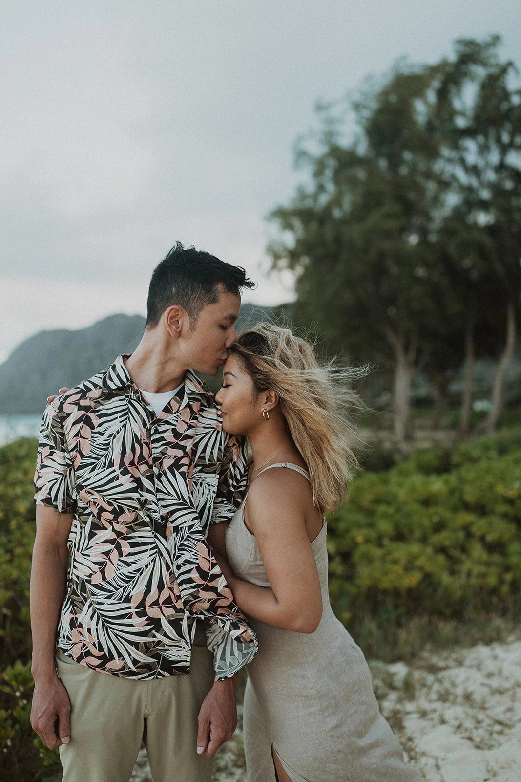 Everything about this romantic beach couples session was so dreamy!! Shooting in Hawaii is always such a treat because the landscape is so diverse and unique – you can get dramatic mountains one second and sweeping coastal beaches the next. For this romantic sunset session, we were able to catch the perfect evening lighting on Oahu’s east side for a dreamy and effortless experience.