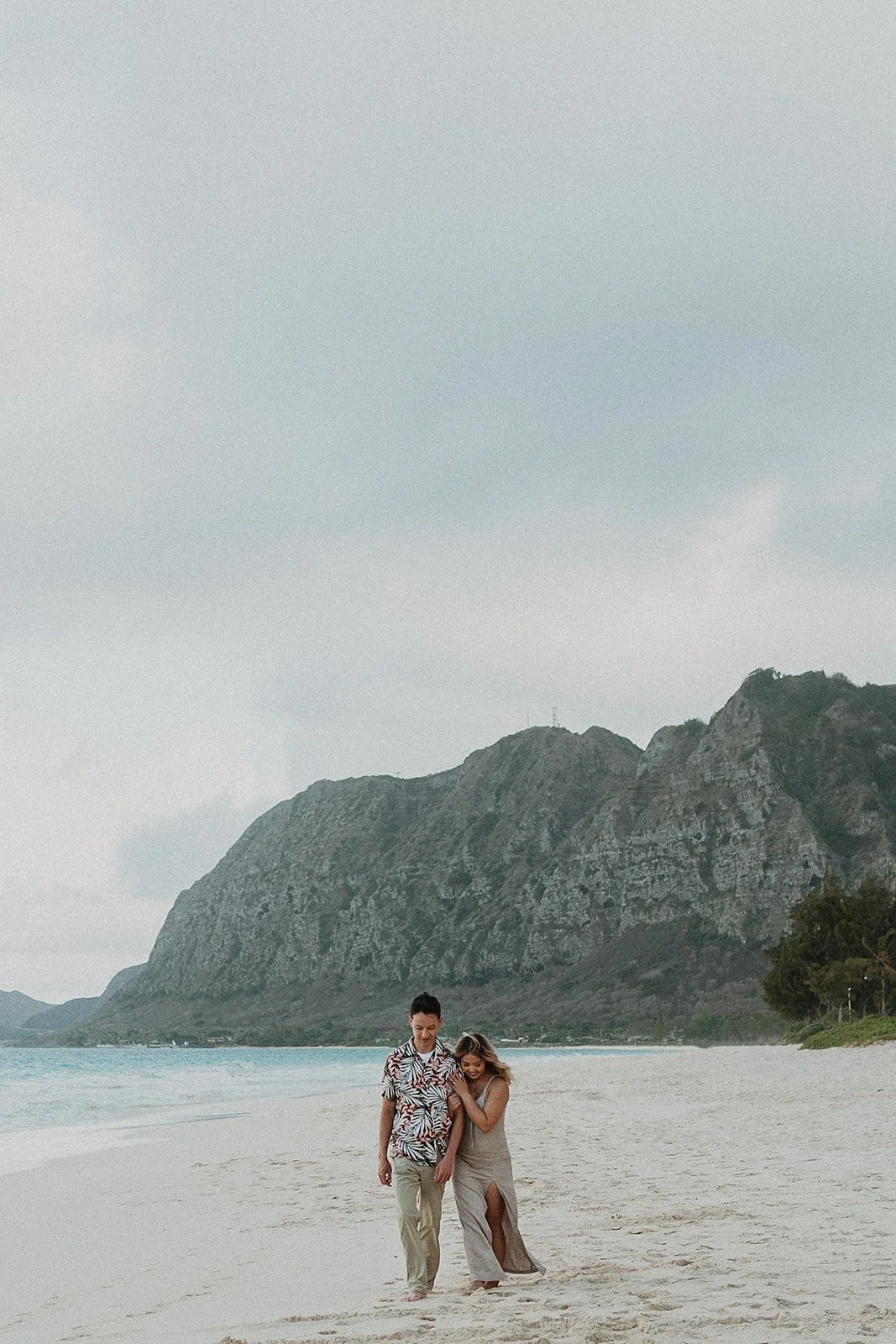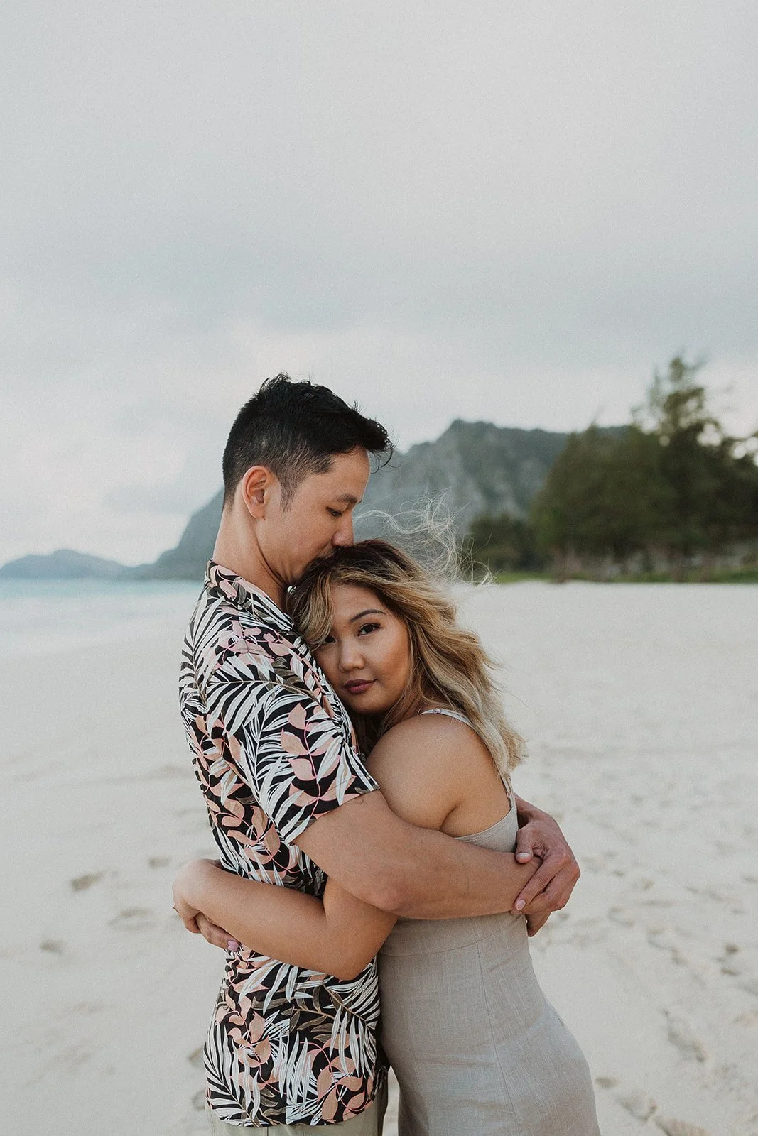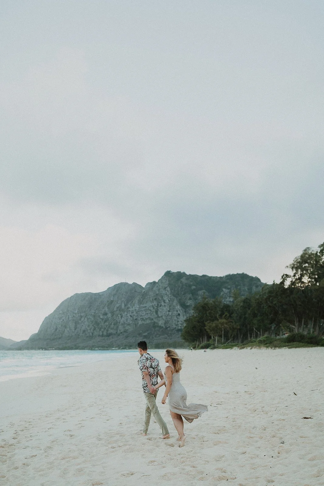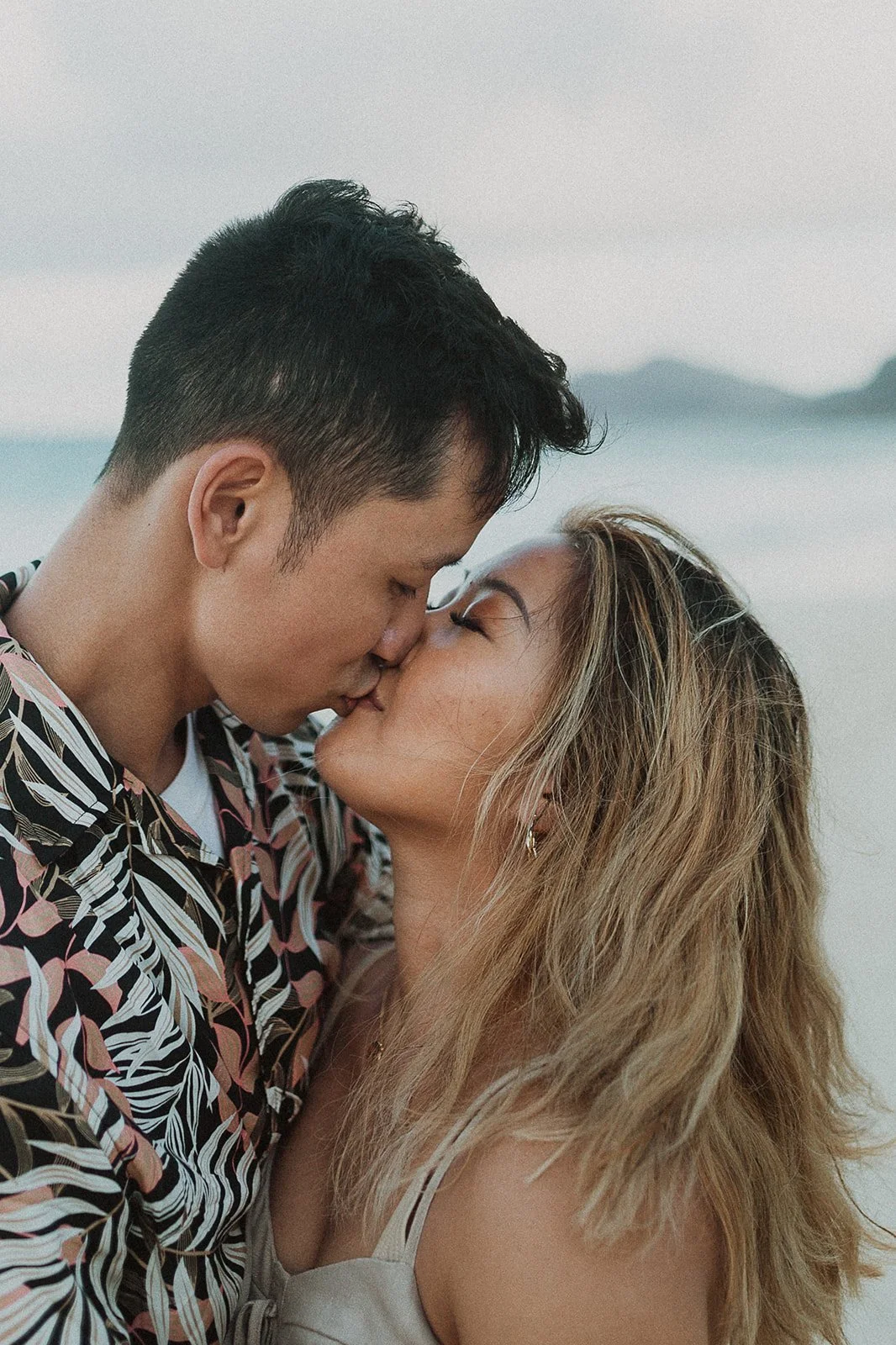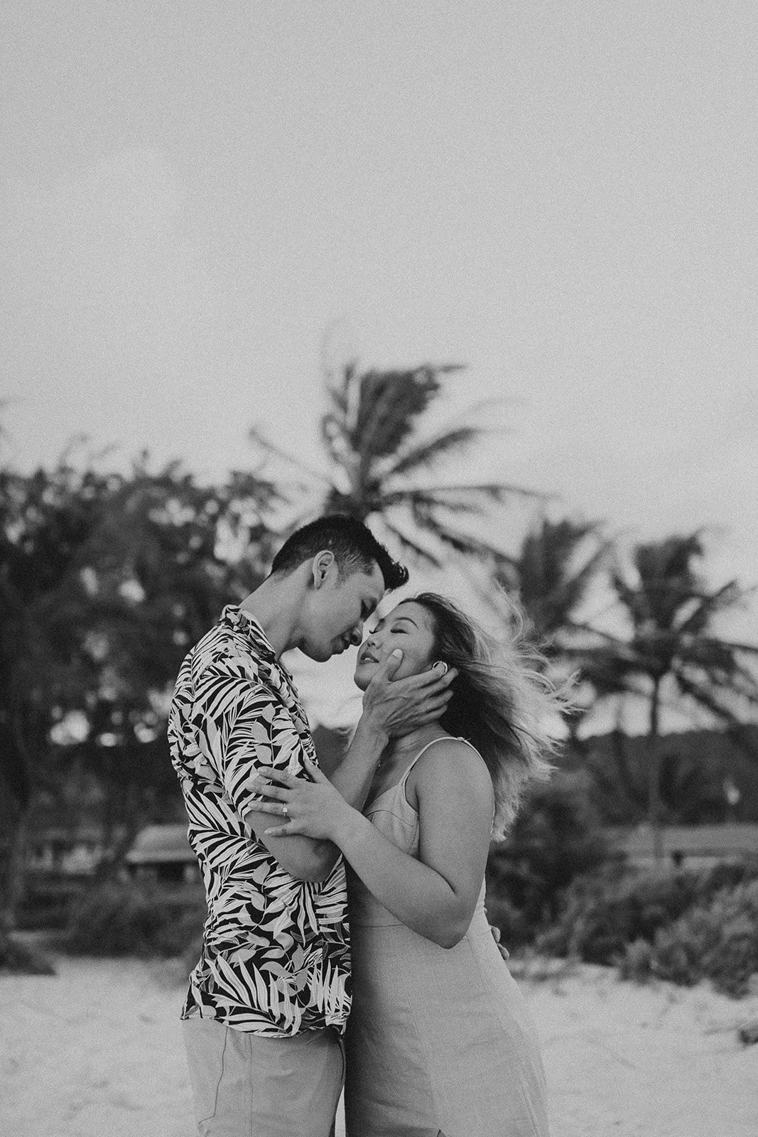 Everything about this romantic beach couples session was so dreamy!! Shooting in Hawaii is always such a treat because the landscape is so diverse and unique – you can get dramatic mountains one second and sweeping coastal beaches the next. For this romantic sunset session, we were able to catch the perfect evening lighting on Oahu’s east side for a dreamy and effortless experience.