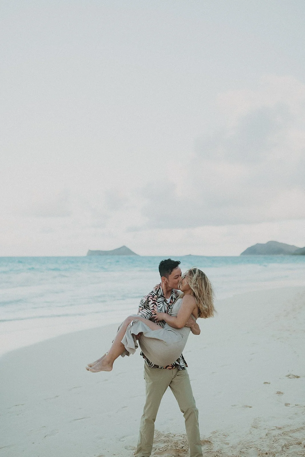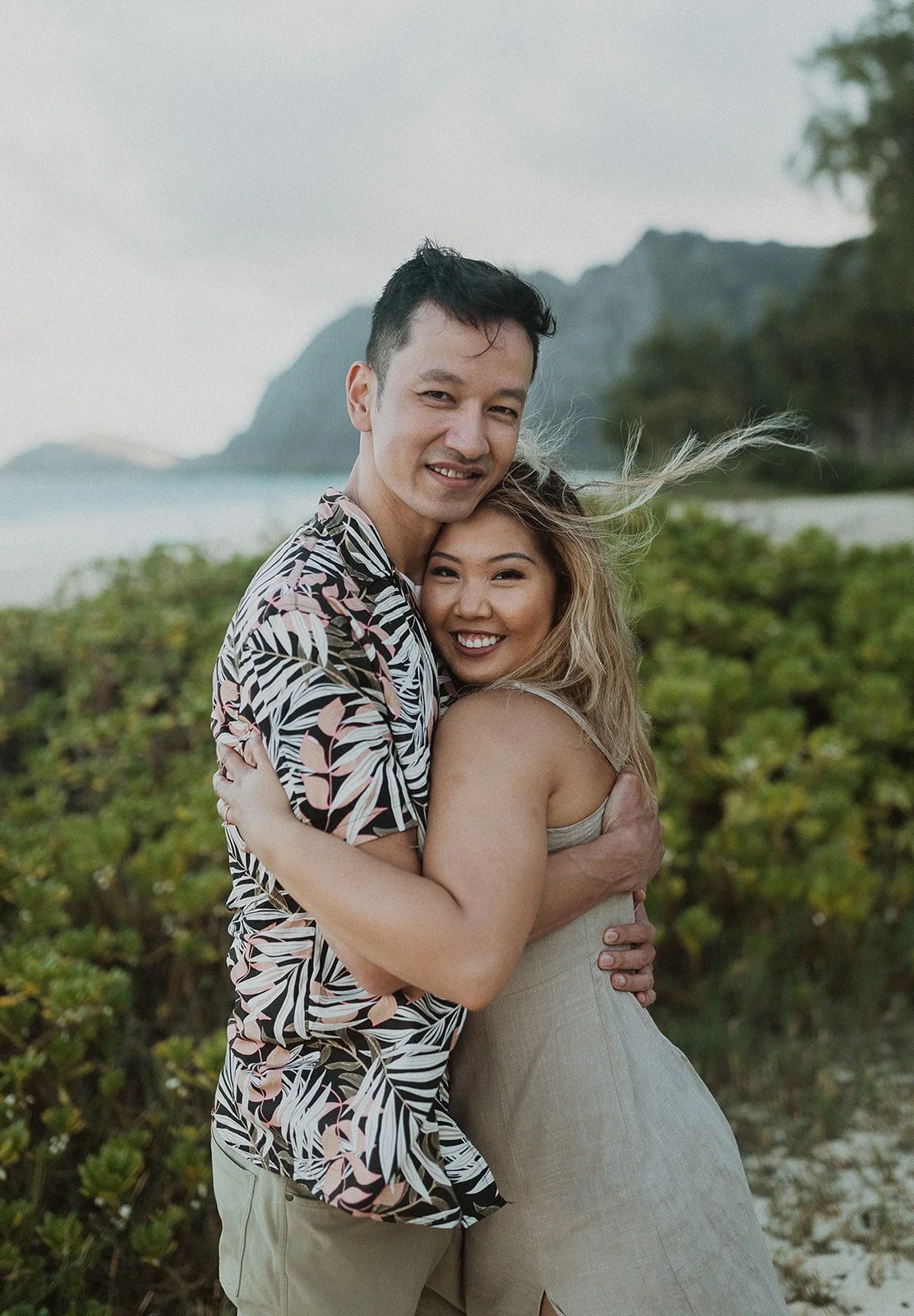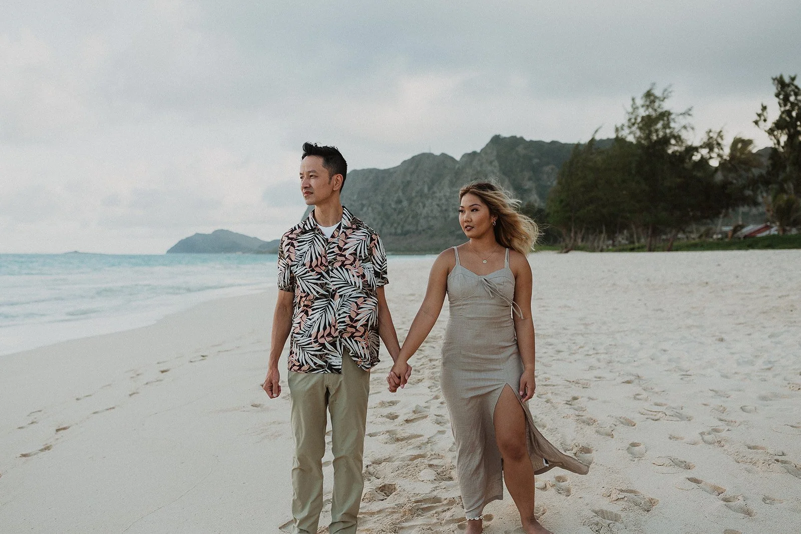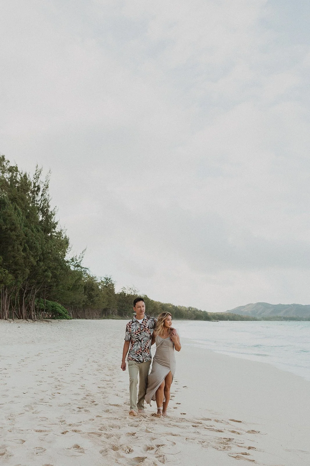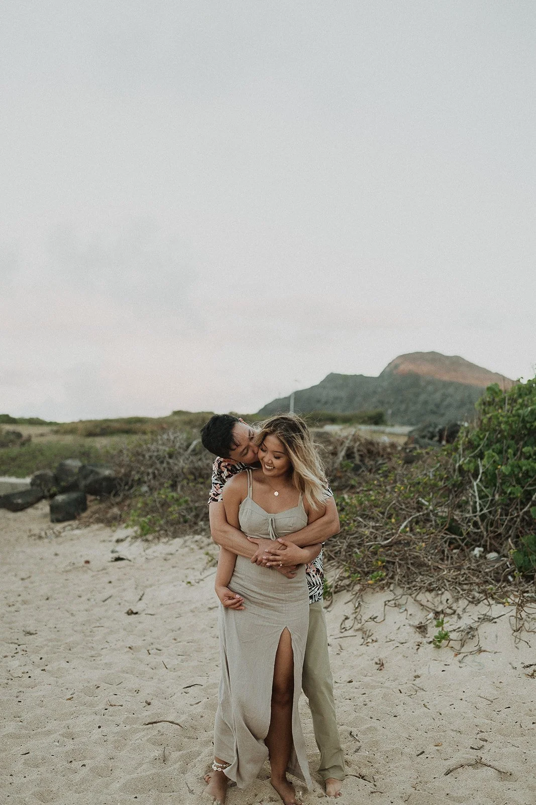 Everything about this romantic beach couples session was so dreamy!! Shooting in Hawaii is always such a treat because the landscape is so diverse and unique – you can get dramatic mountains one second and sweeping coastal beaches the next. For this romantic sunset session, we were able to catch the perfect evening lighting on Oahu’s east side for a dreamy and effortless experience.
