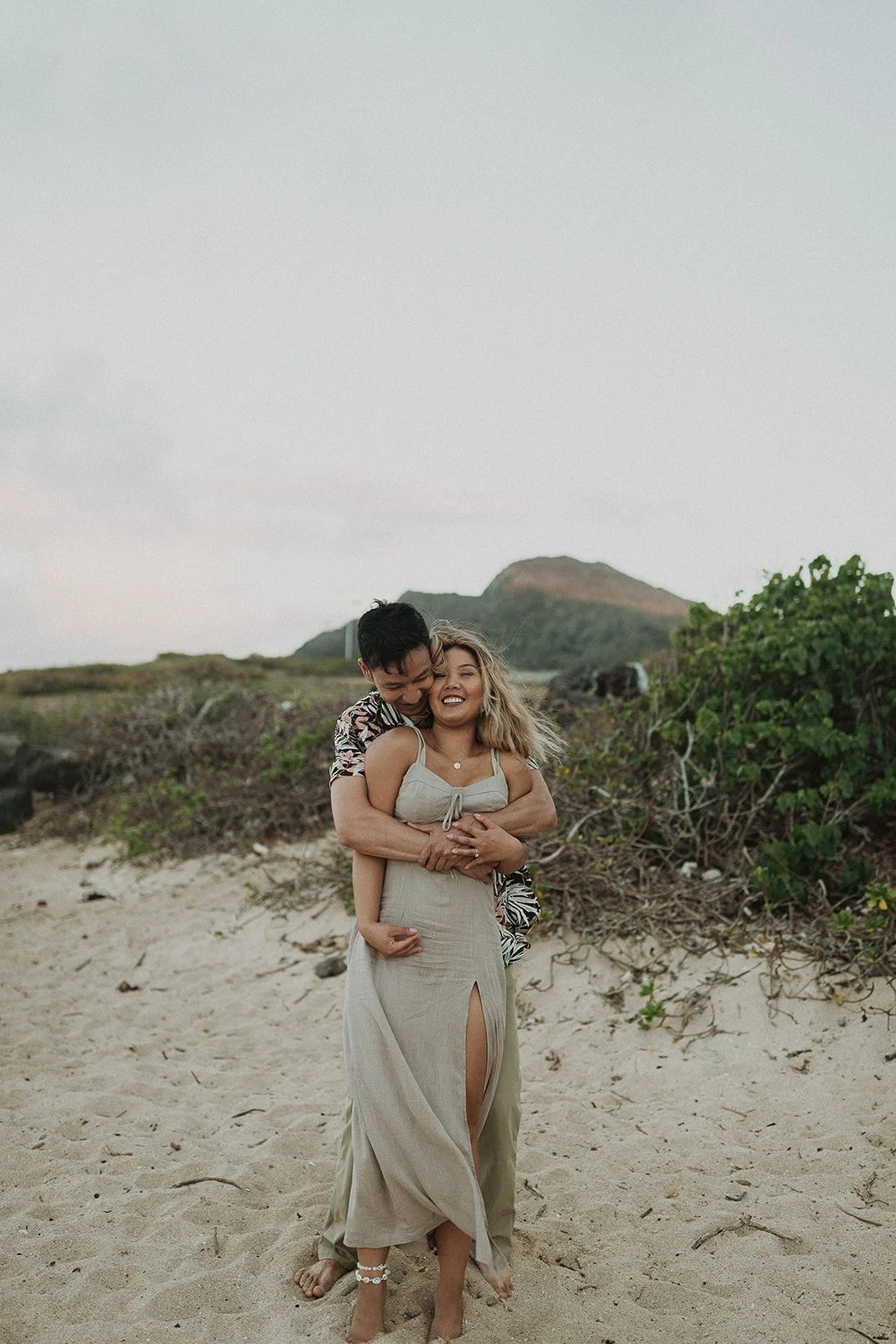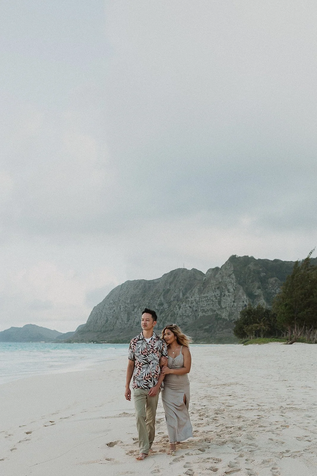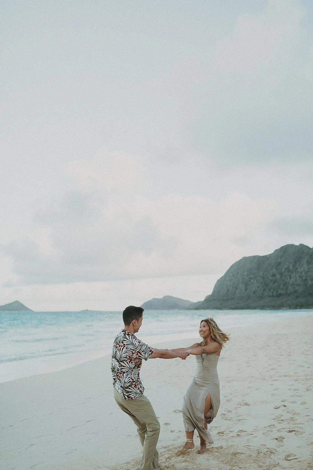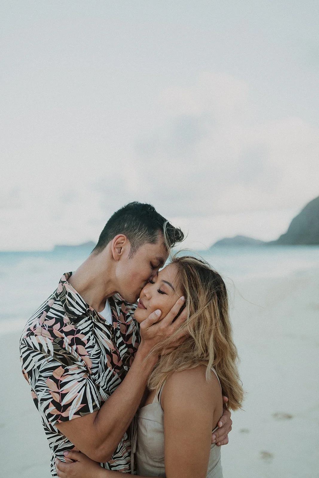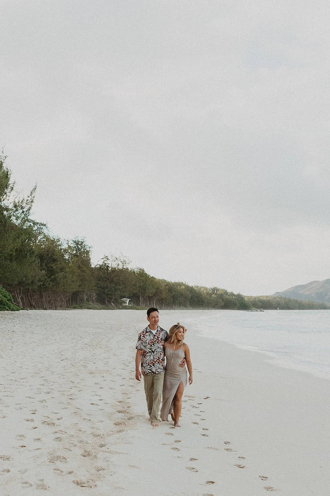 Everything about this romantic beach couples session was so dreamy!! Shooting in Hawaii is always such a treat because the landscape is so diverse and unique – you can get dramatic mountains one second and sweeping coastal beaches the next. For this romantic sunset session, we were able to catch the perfect evening lighting on Oahu’s east side for a dreamy and effortless experience.