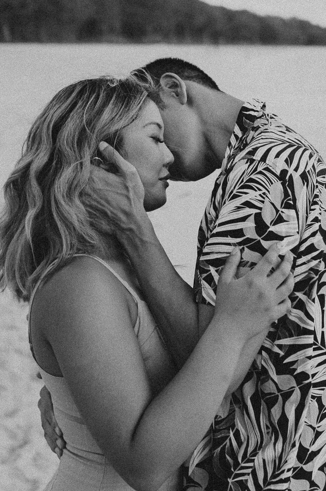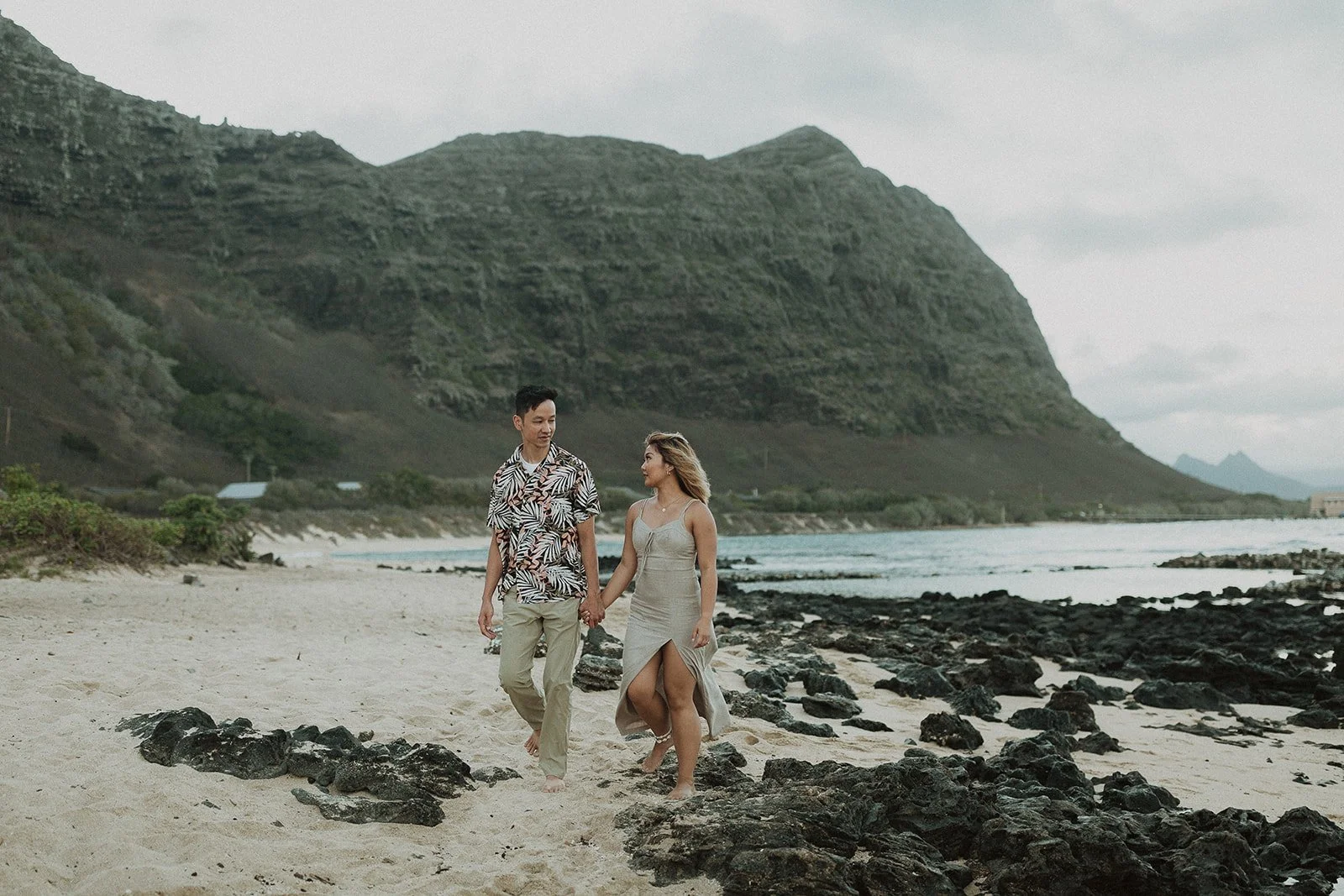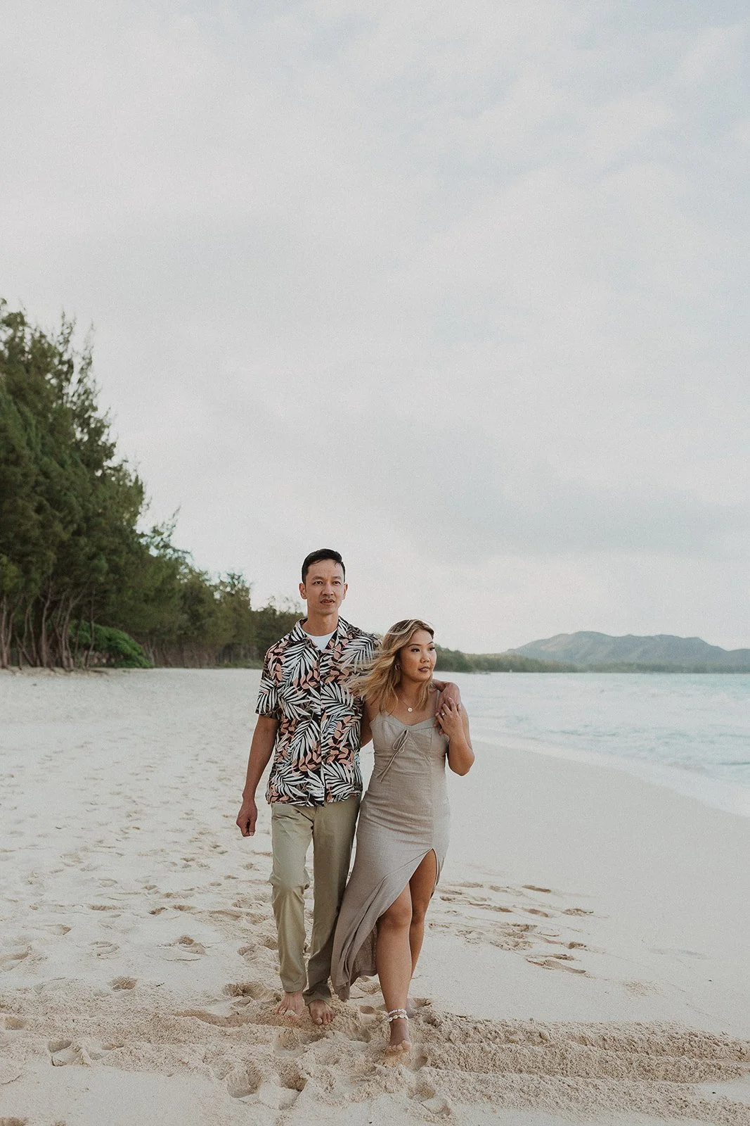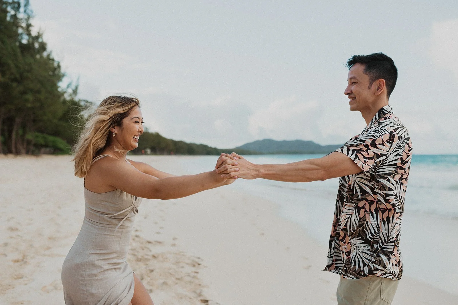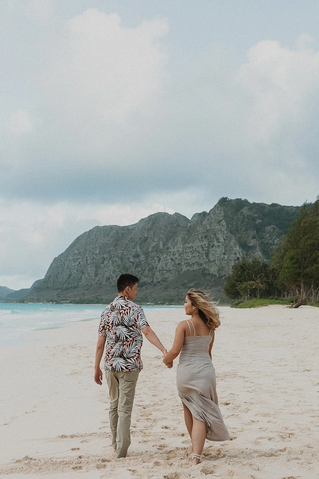 Everything about this romantic beach couples session was so dreamy!! Shooting in Hawaii is always such a treat because the landscape is so diverse and unique – you can get dramatic mountains one second and sweeping coastal beaches the next. For this romantic sunset session, we were able to catch the perfect evening lighting on Oahu’s east side for a dreamy and effortless experience.