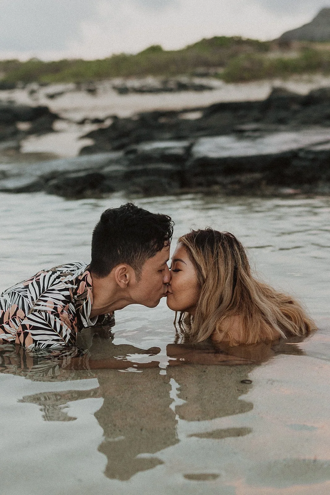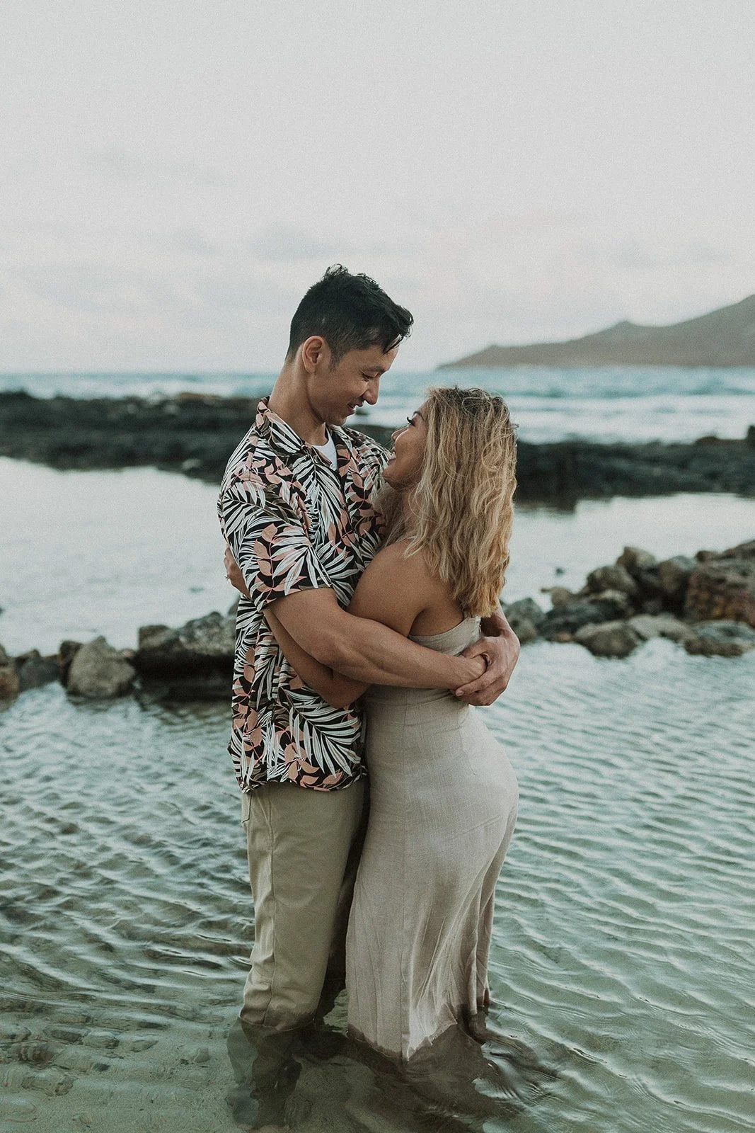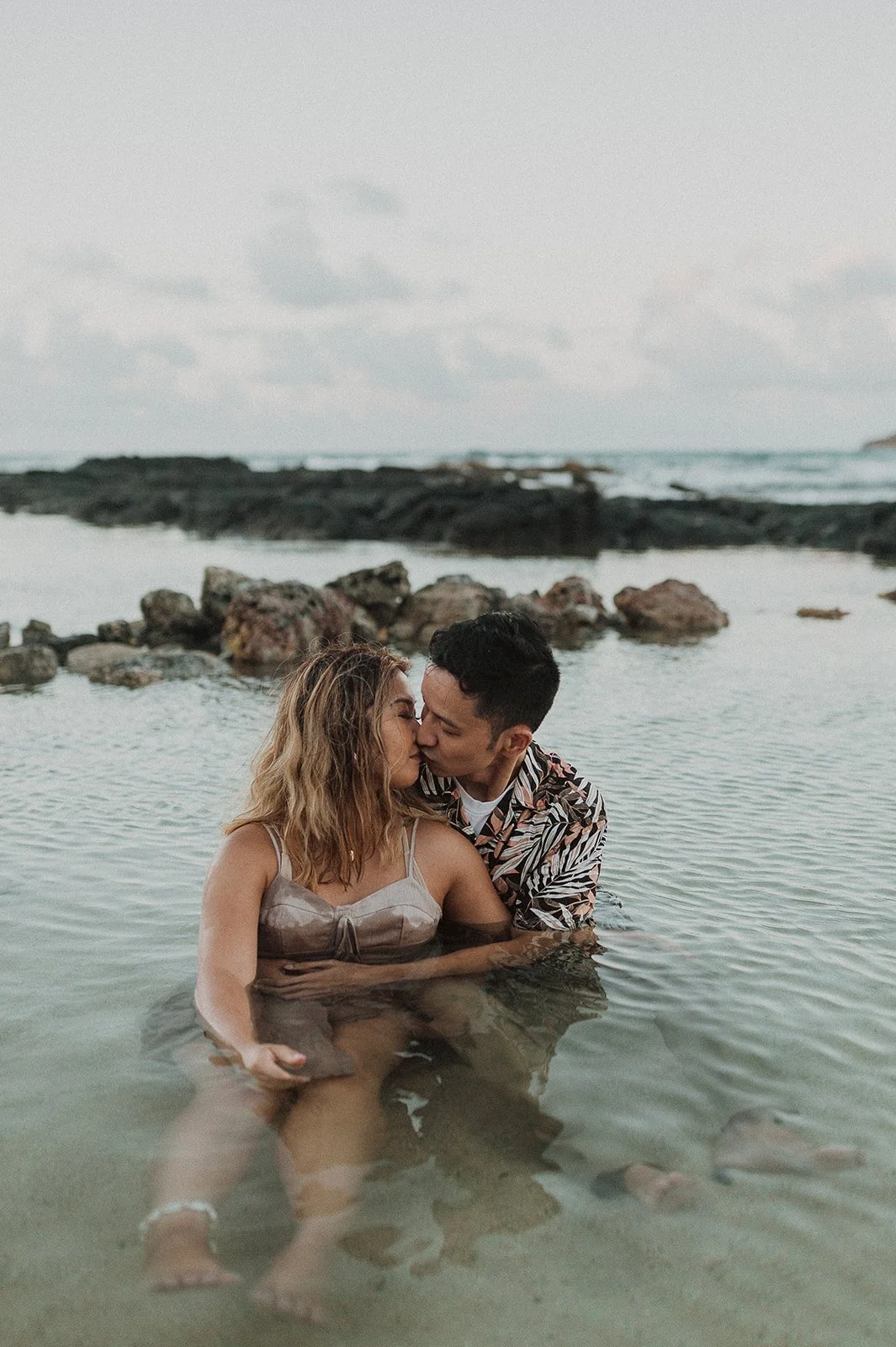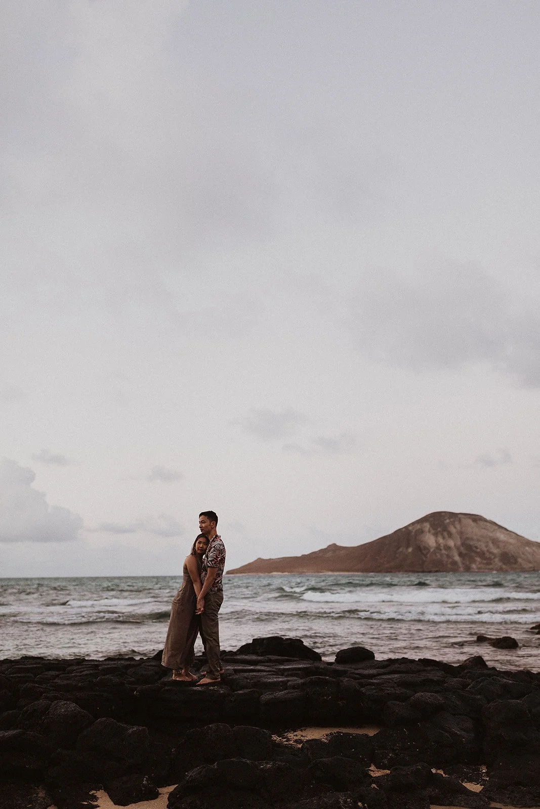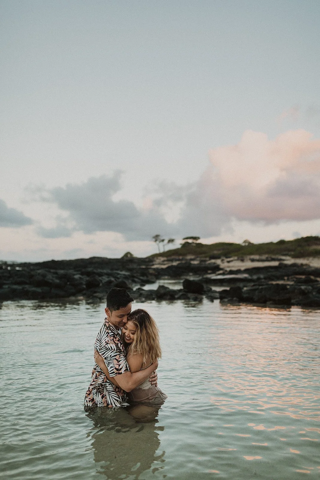 The couple wanted to capture a variety of different locations, so we adventured around Oahu’s east side and a few hit different beaches to really maximize the experience. Usually, that side of the island is best for sunrise in terms of lighting, but we decided to shoot at sunset for a softer + more delicate look; and let me tell you, it did not disappoint!