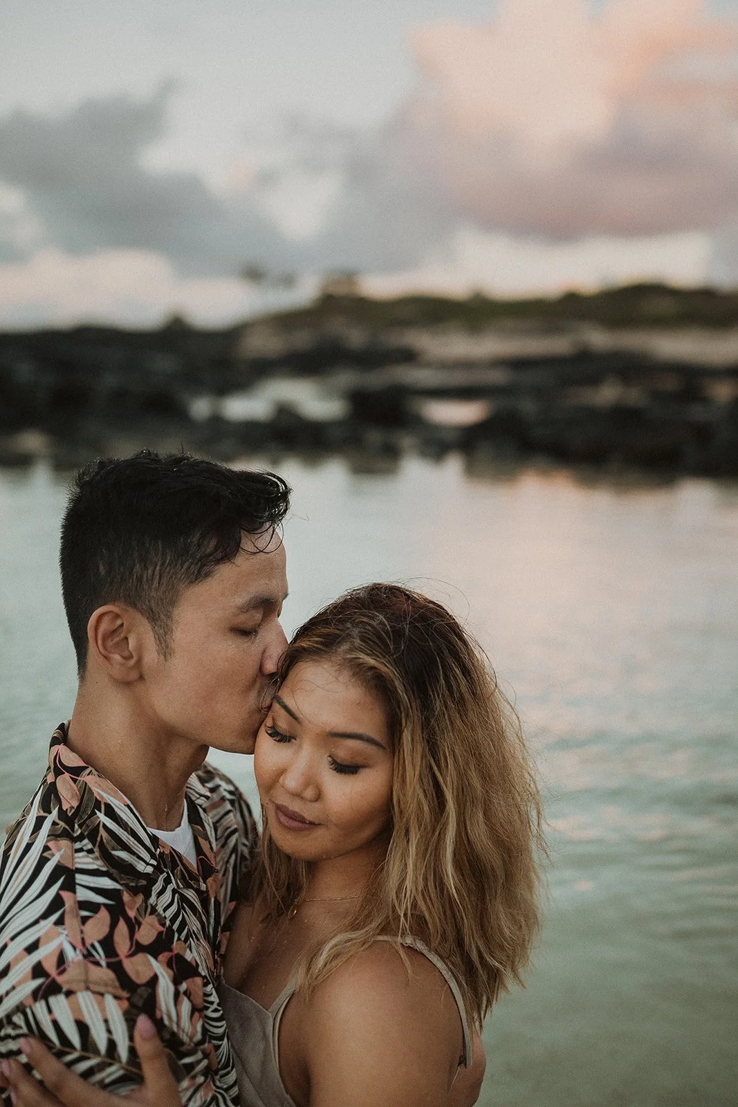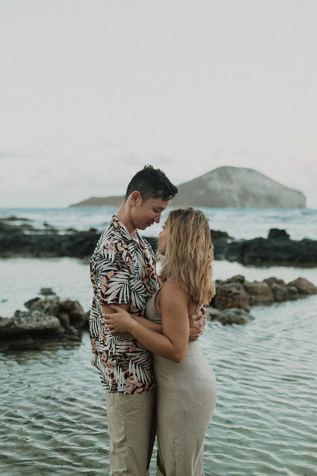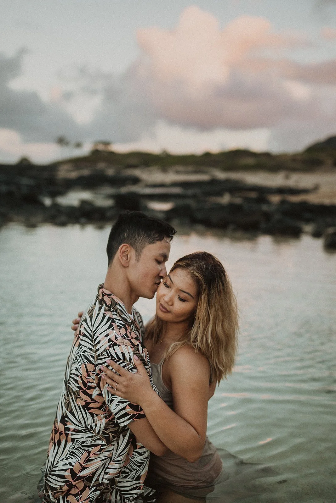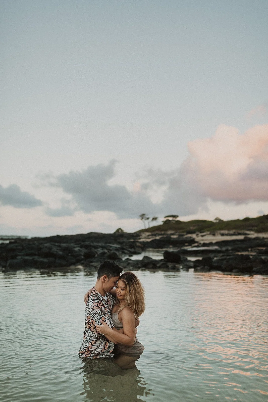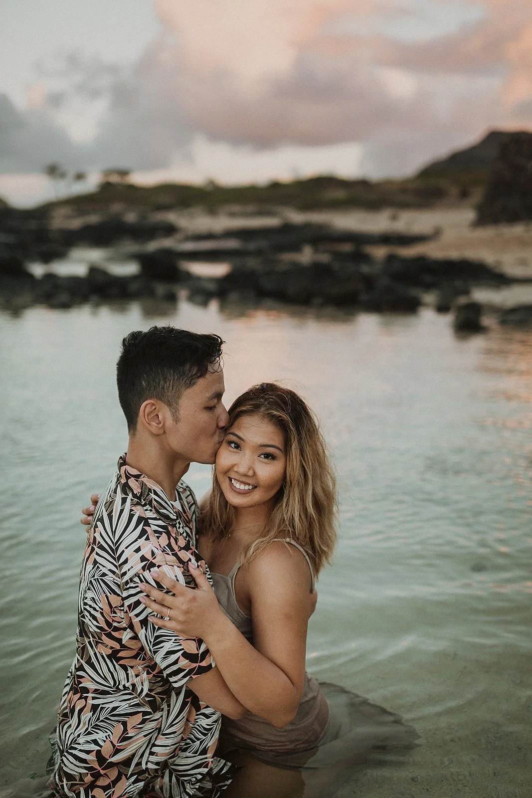The couple wanted to capture a variety of different locations, so we adventured around Oahu’s east side and a few hit different beaches to really maximize the experience. Usually, that side of the island is best for sunrise in terms of lighting, but we decided to shoot at sunset for a softer + more delicate look; and let me tell you, it did not disappoint!
