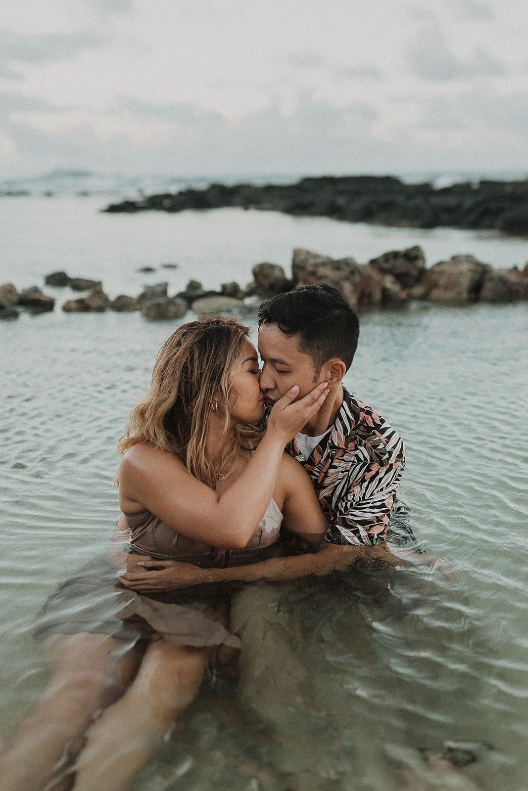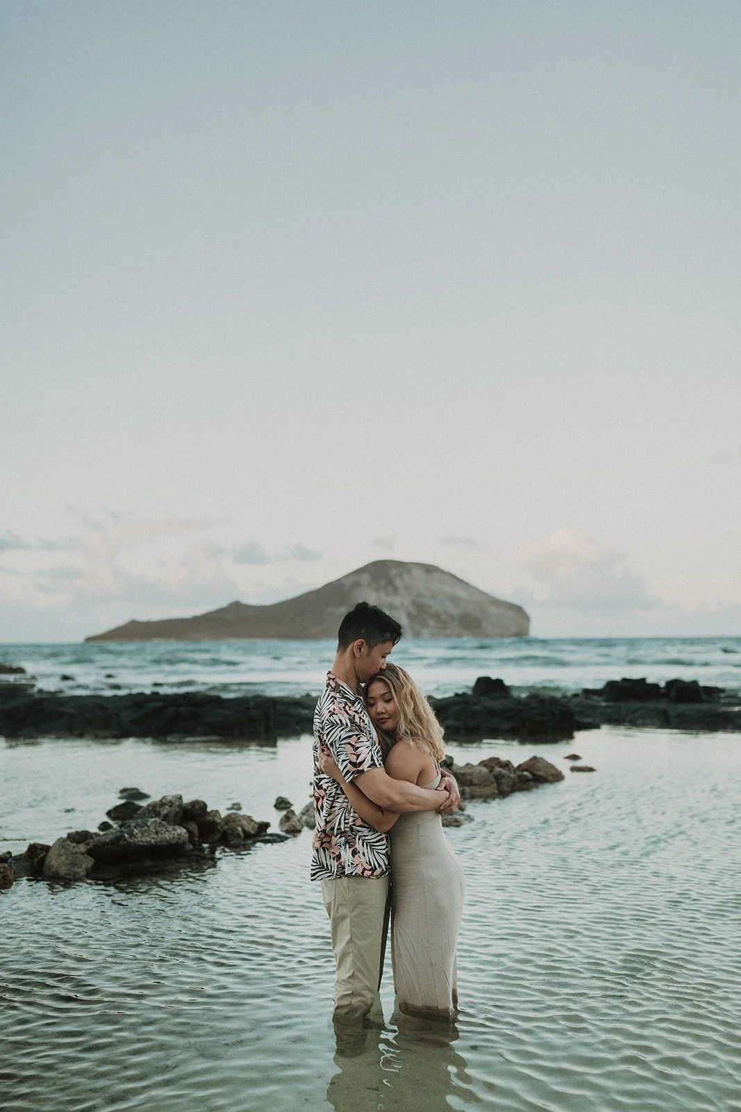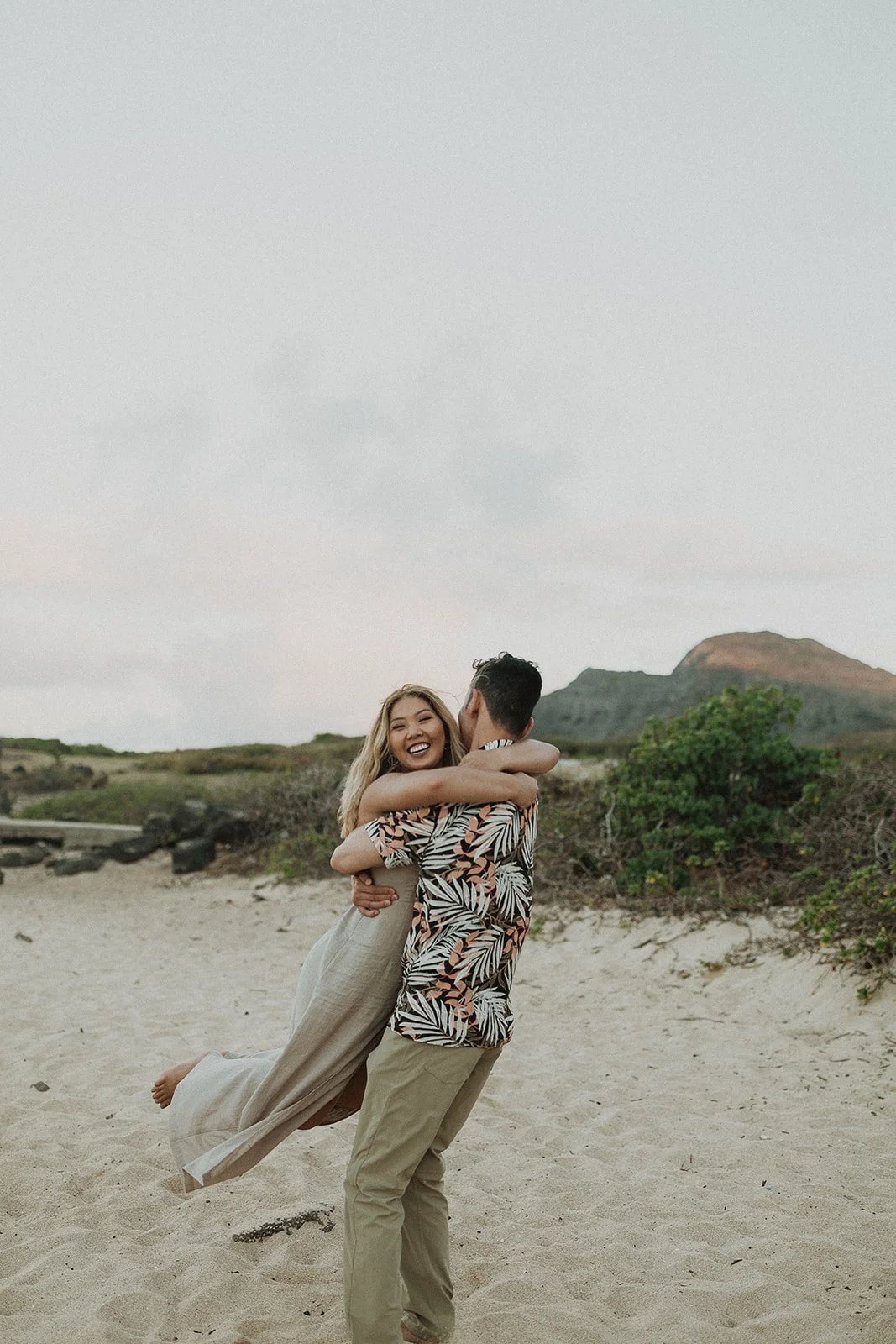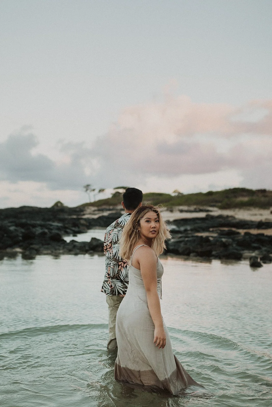 The couple wanted to capture a variety of different locations, so we adventured around Oahu’s east side and a few hit different beaches to really maximize the experience. Usually, that side of the island is best for sunrise in terms of lighting, but we decided to shoot at sunset for a softer + more delicate look; and let me tell you, it did not disappoint!