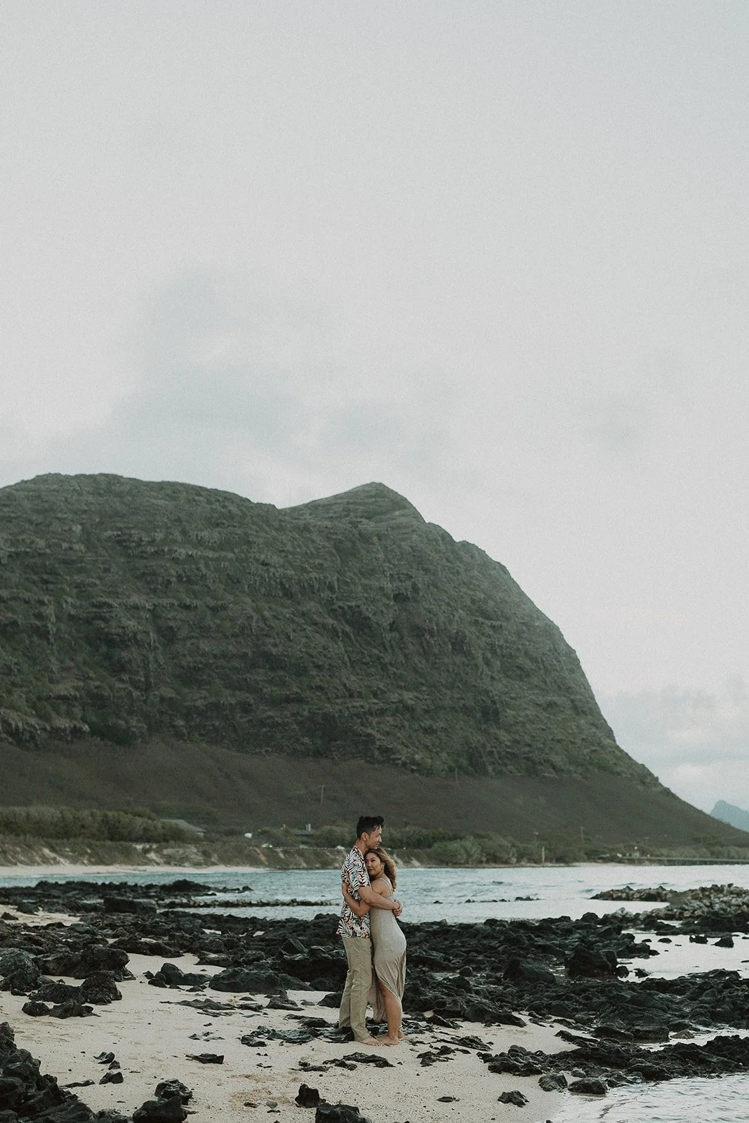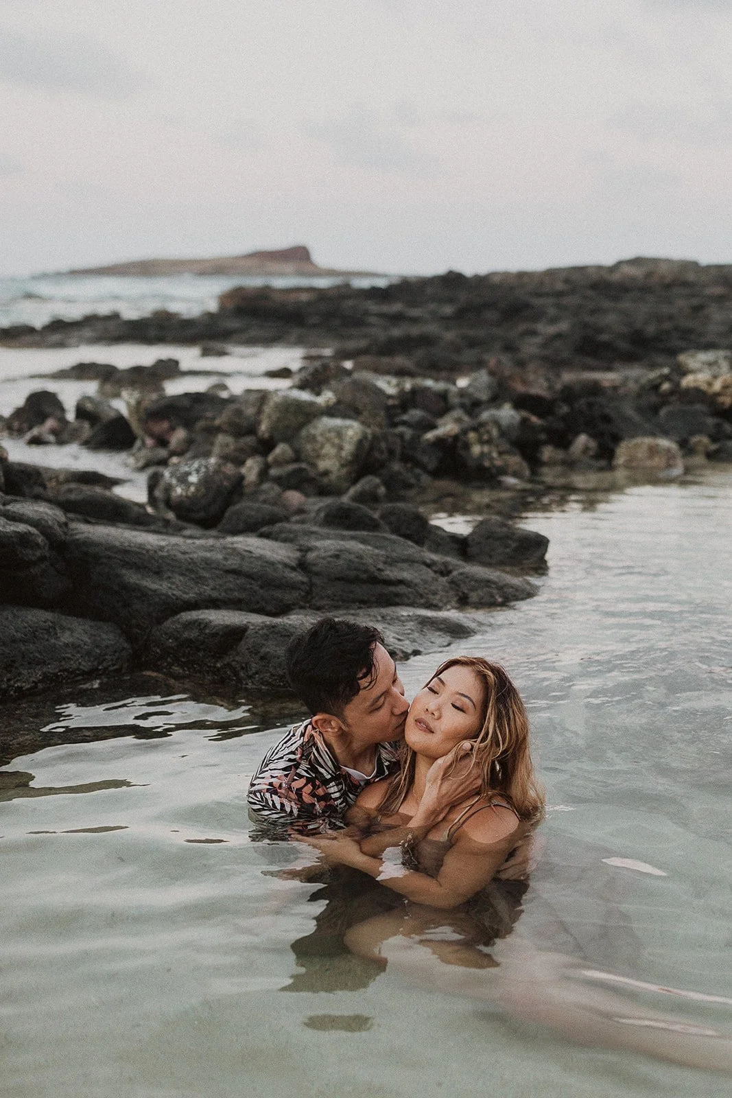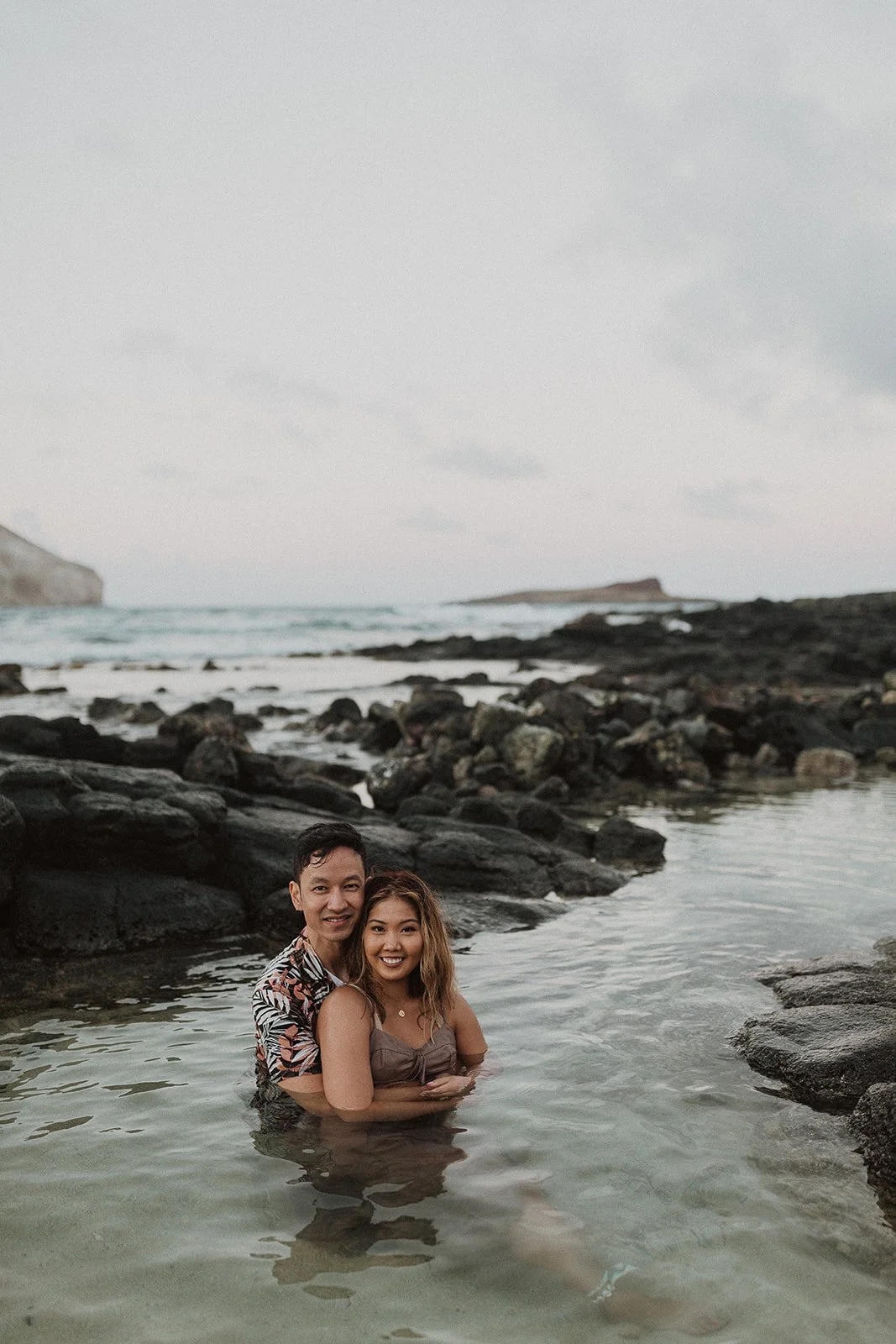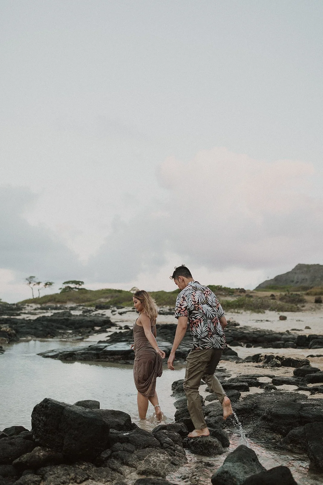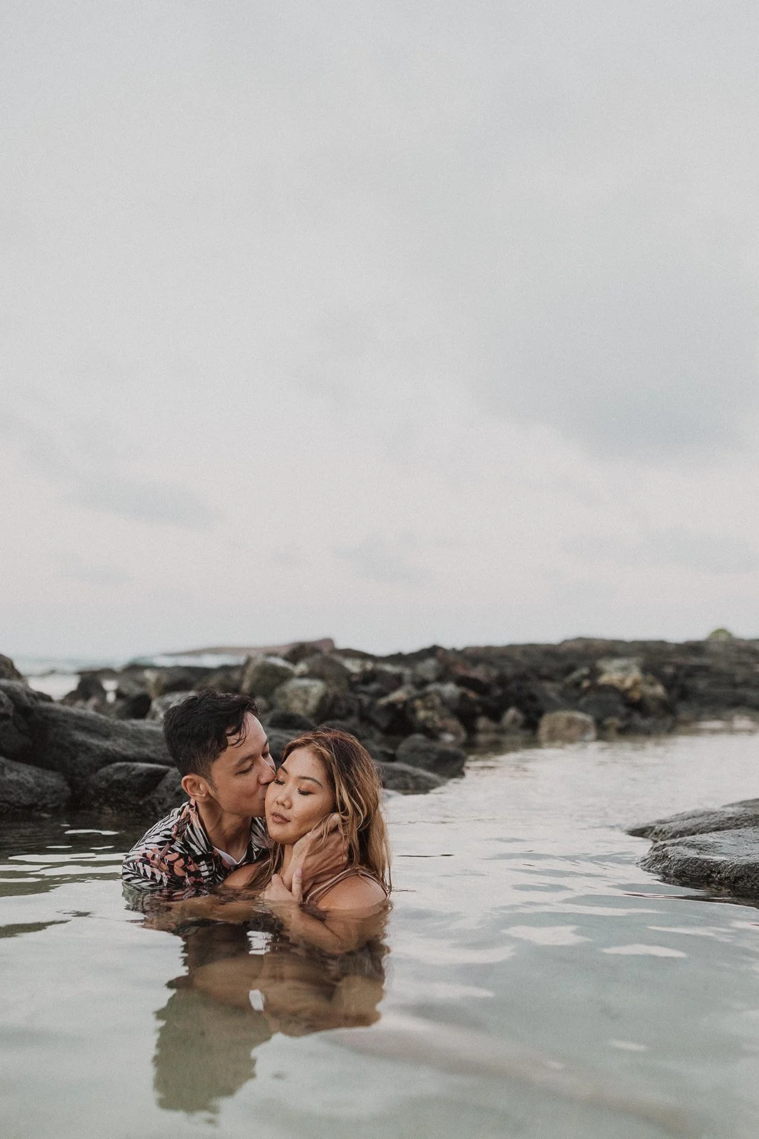 The couple wanted to capture a variety of different locations, so we adventured around Oahu’s east side and a few hit different beaches to really maximize the experience. Usually, that side of the island is best for sunrise in terms of lighting, but we decided to shoot at sunset for a softer + more delicate look; and let me tell you, it did not disappoint!
