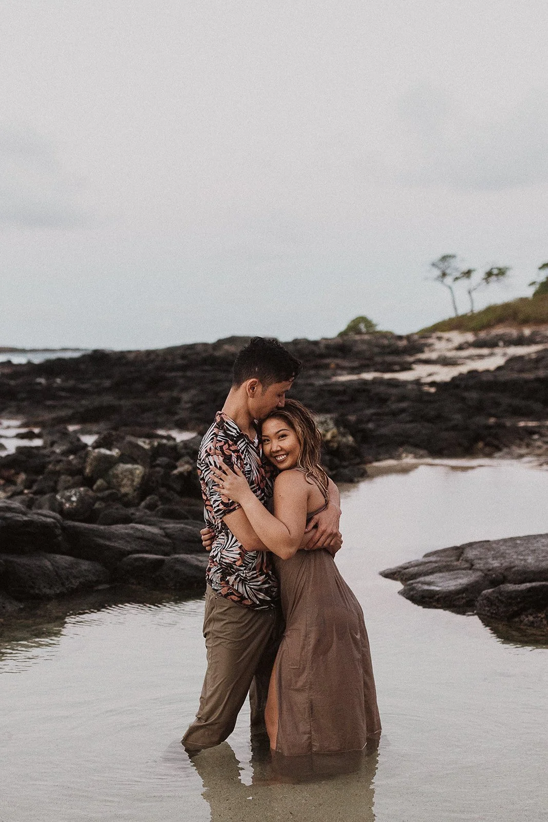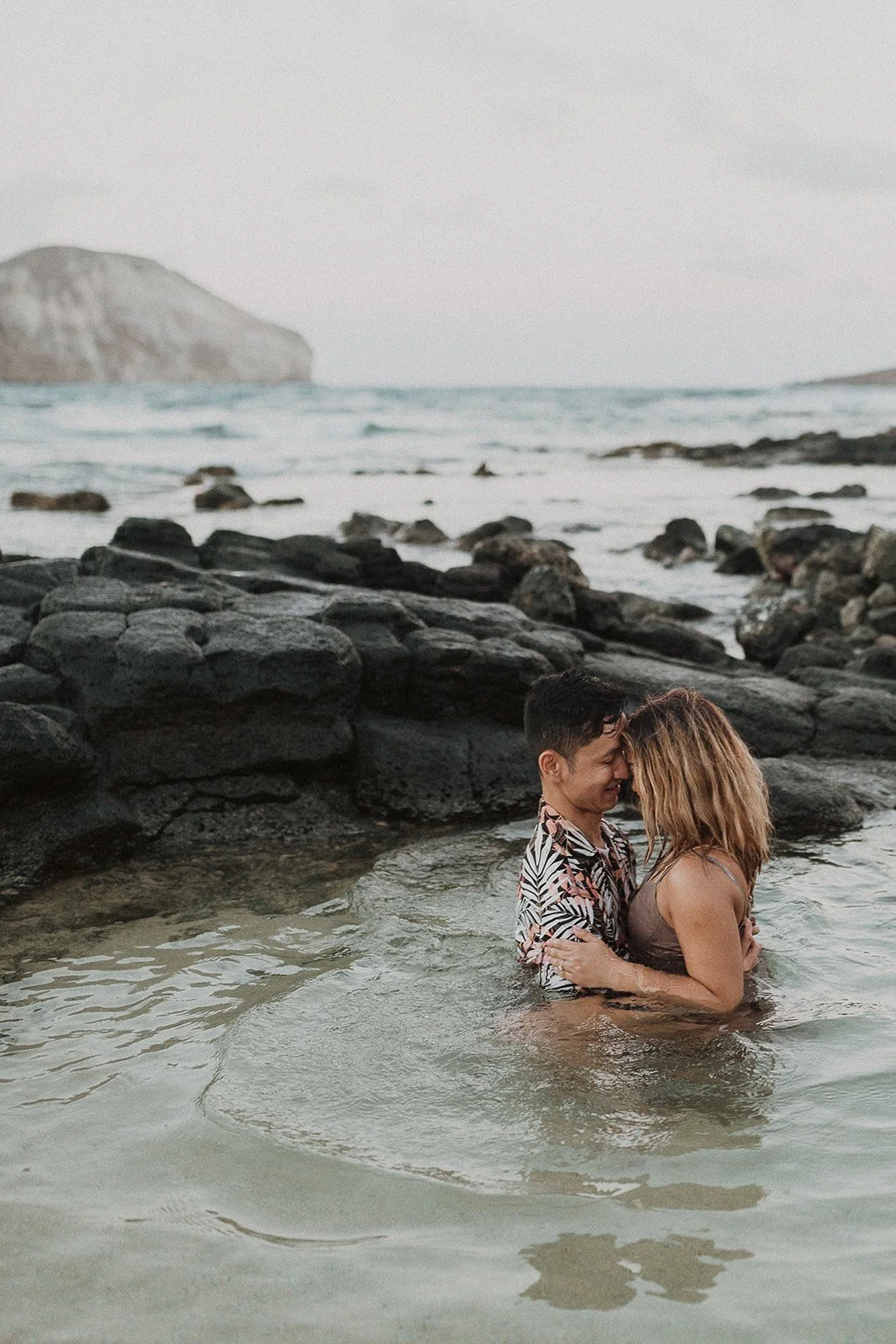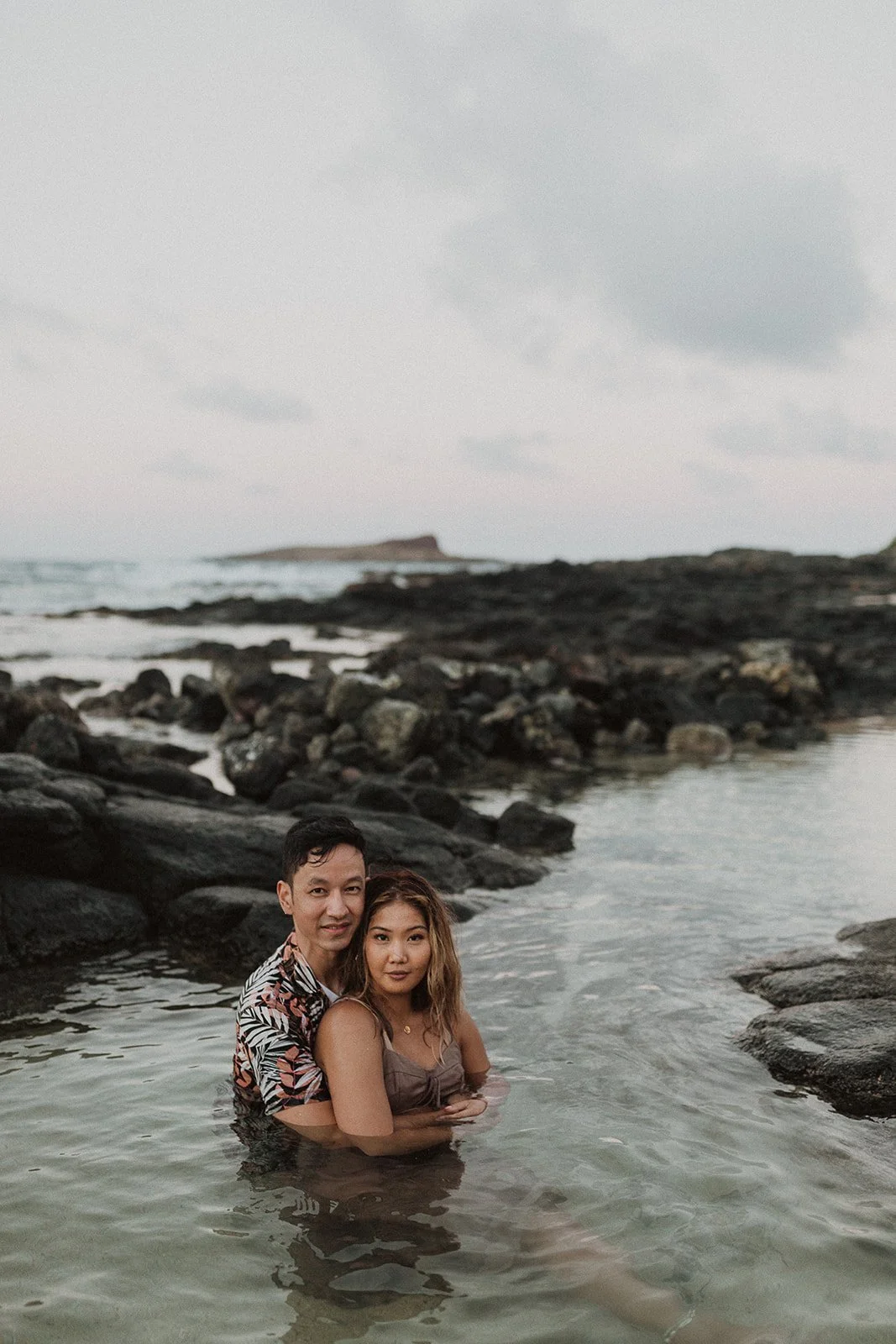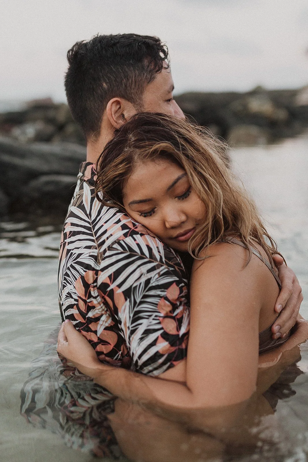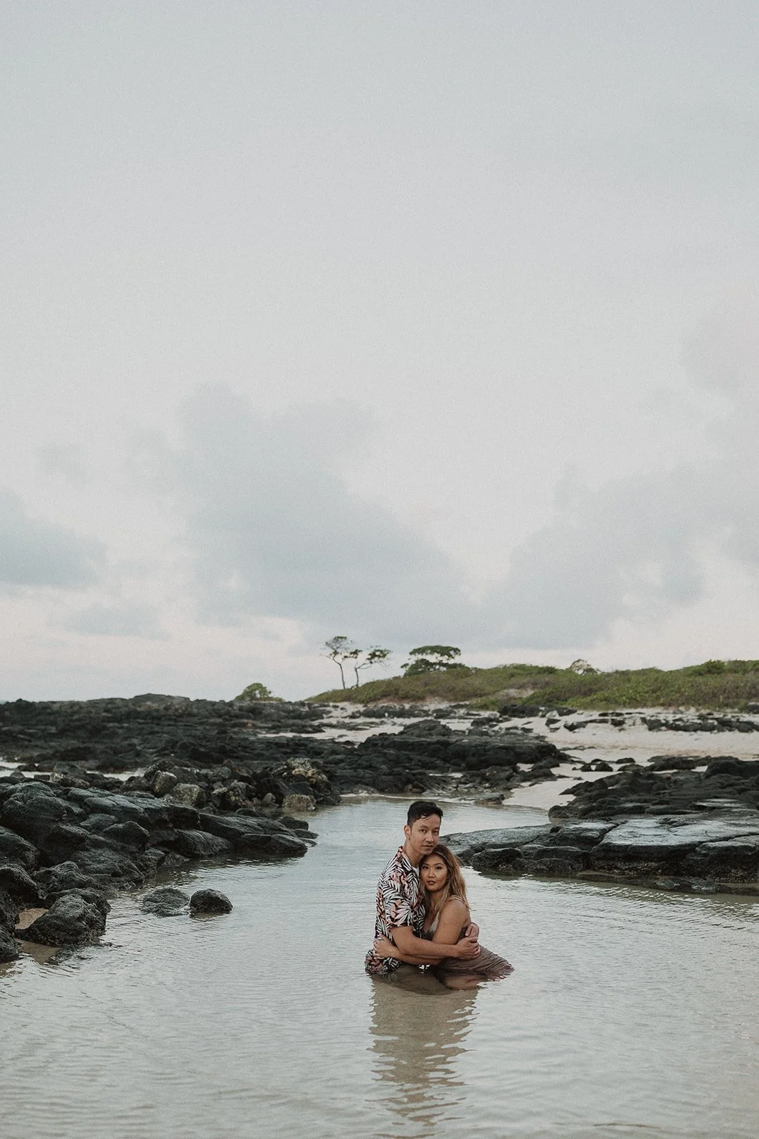 The couple wanted to capture a variety of different locations, so we adventured around Oahu’s east side and a few hit different beaches to really maximize the experience. Usually, that side of the island is best for sunrise in terms of lighting, but we decided to shoot at sunset for a softer + more delicate look; and let me tell you, it did not disappoint!