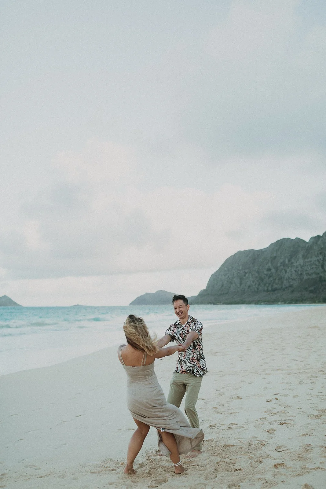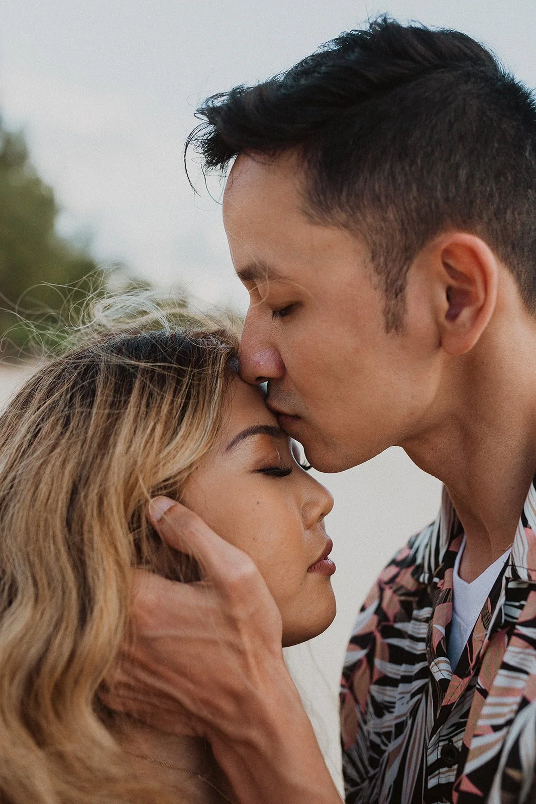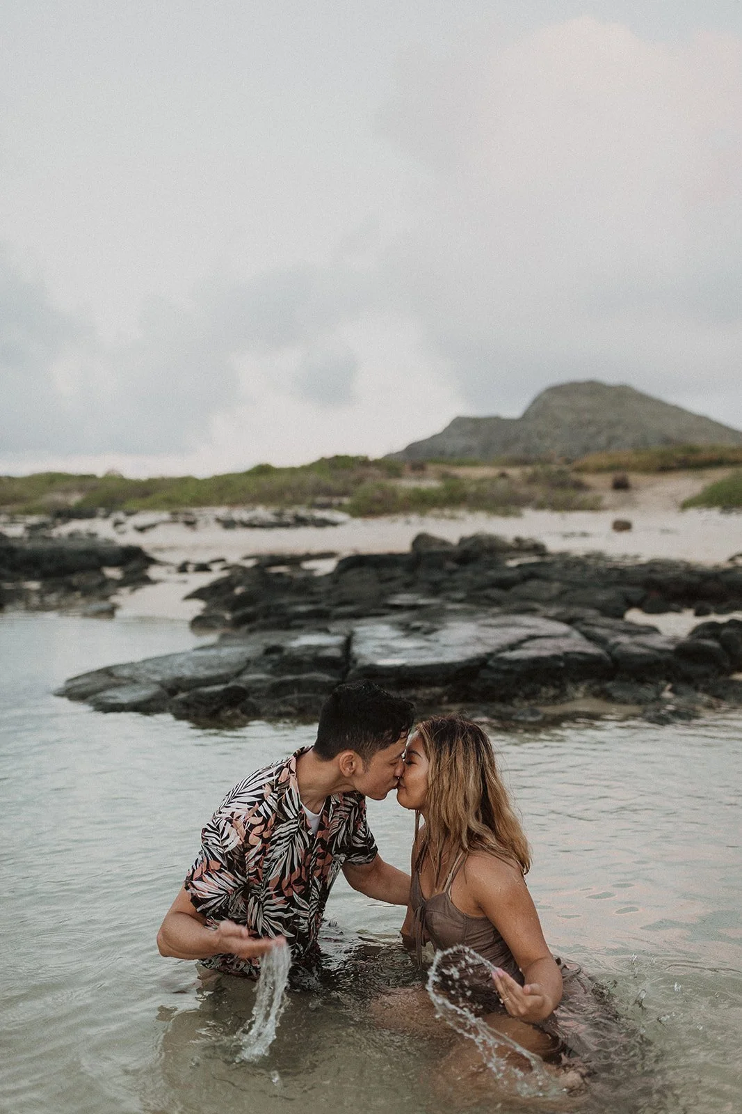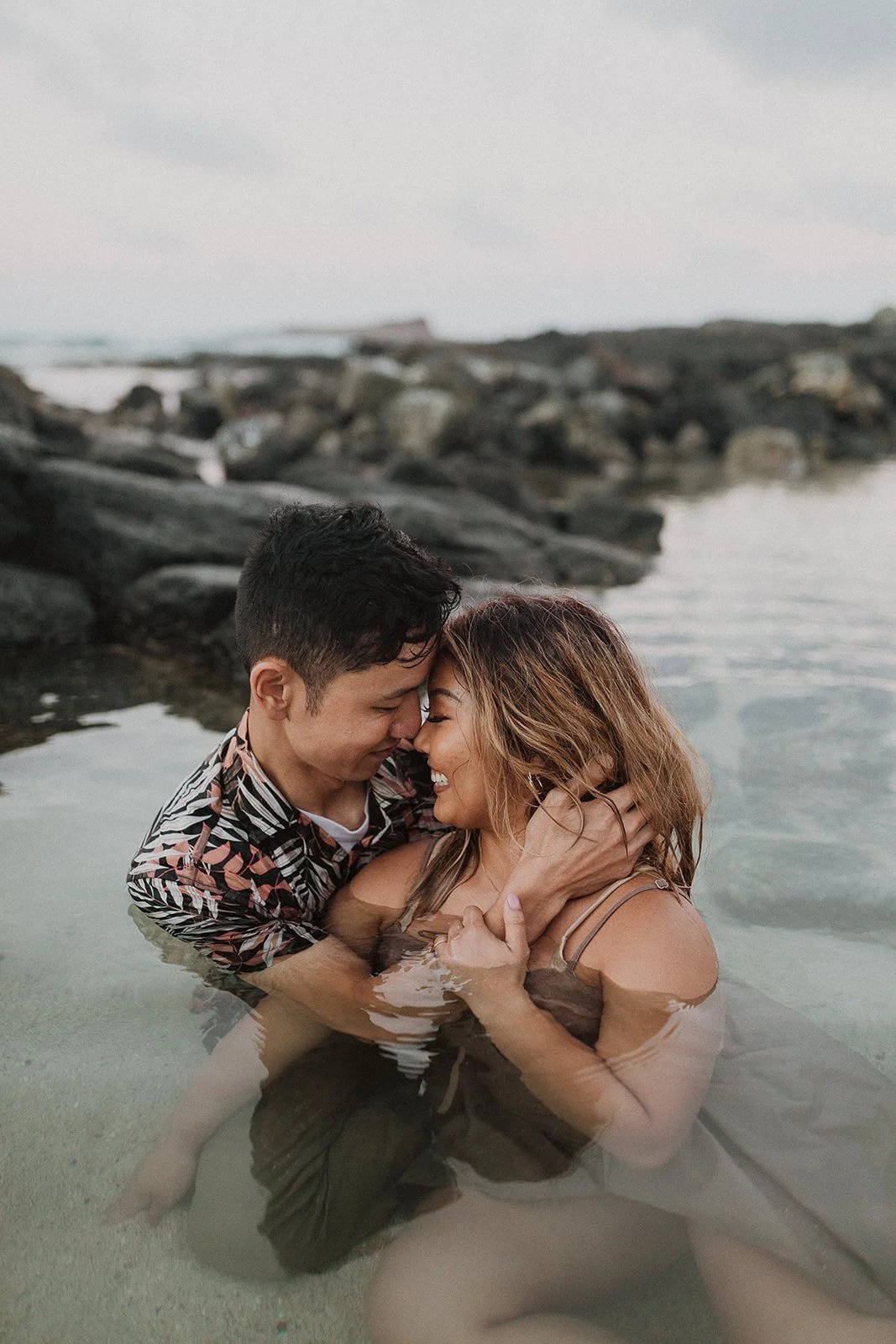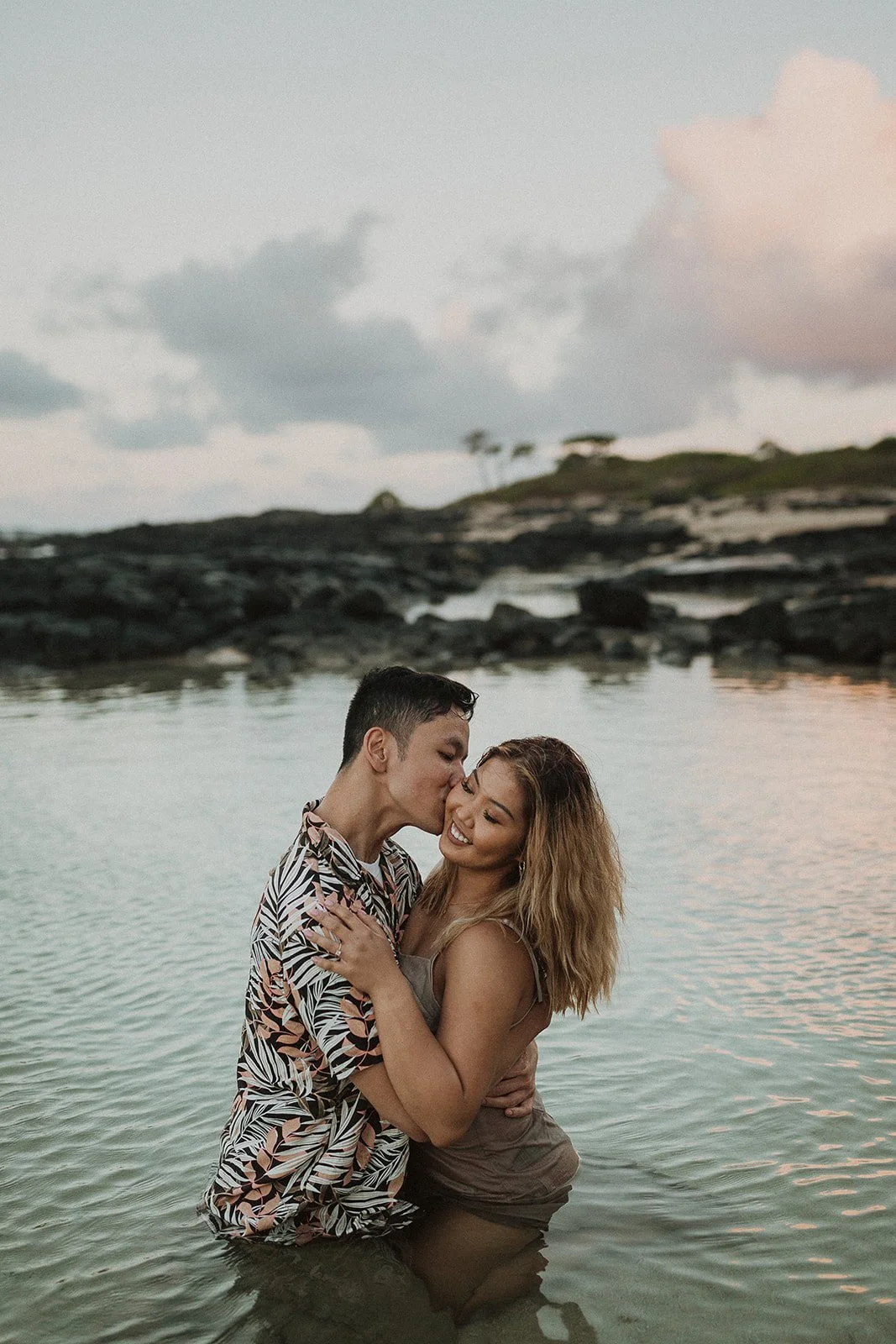 The couple wanted to capture a variety of different locations, so we adventured around Oahu’s east side and a few hit different beaches to really maximize the experience. Usually, that side of the island is best for sunrise in terms of lighting, but we decided to shoot at sunset for a softer + more delicate look; and let me tell you, it did not disappoint!