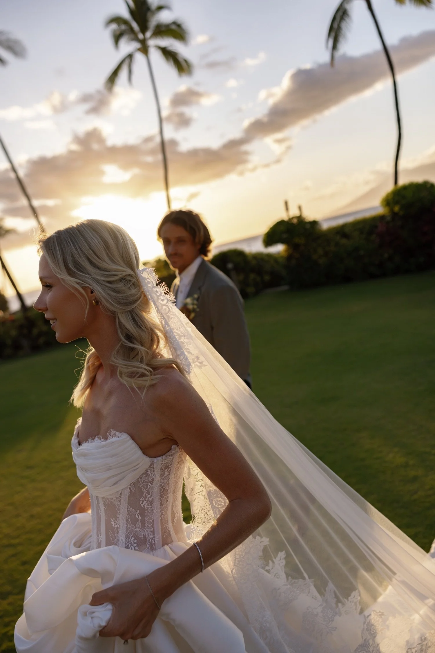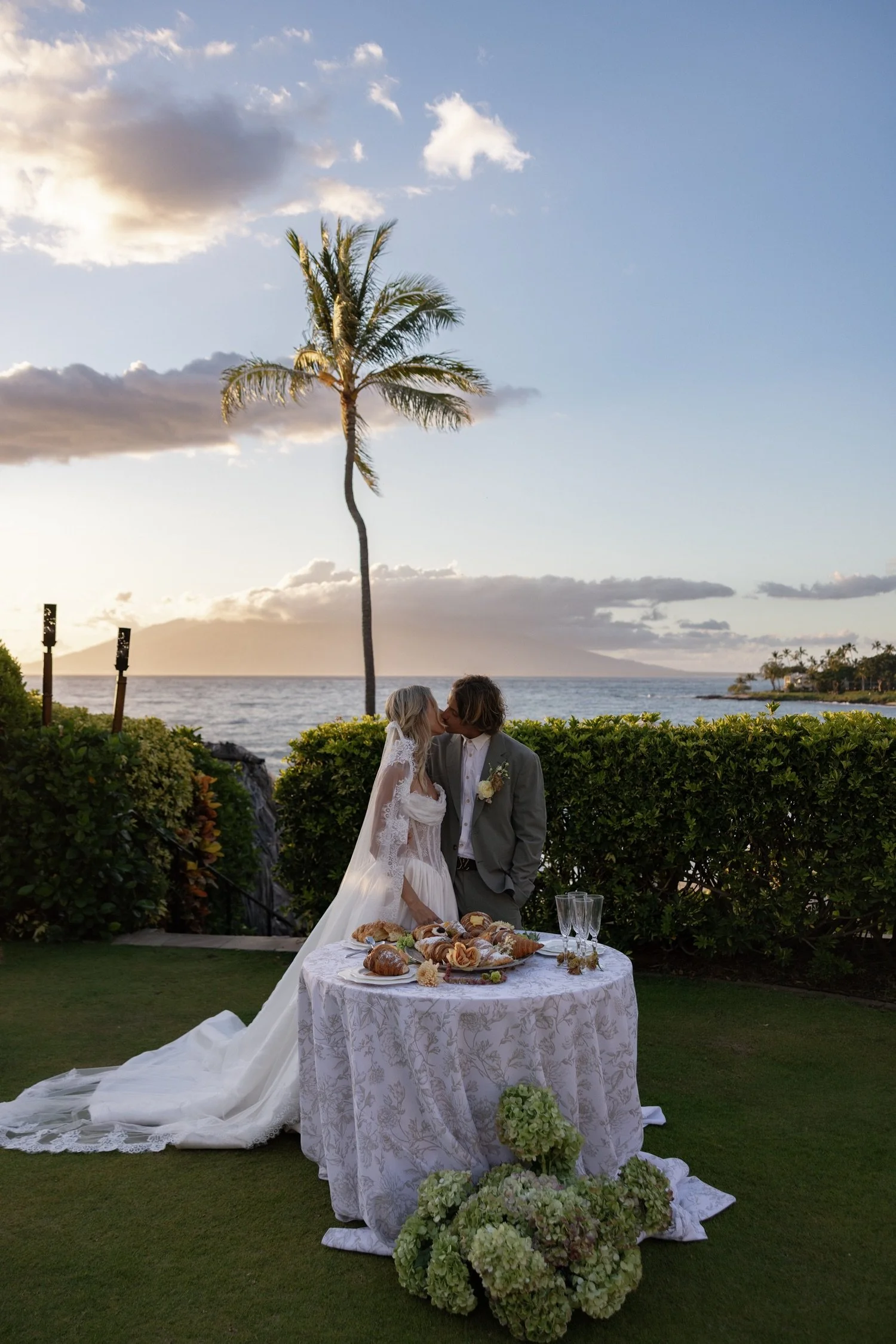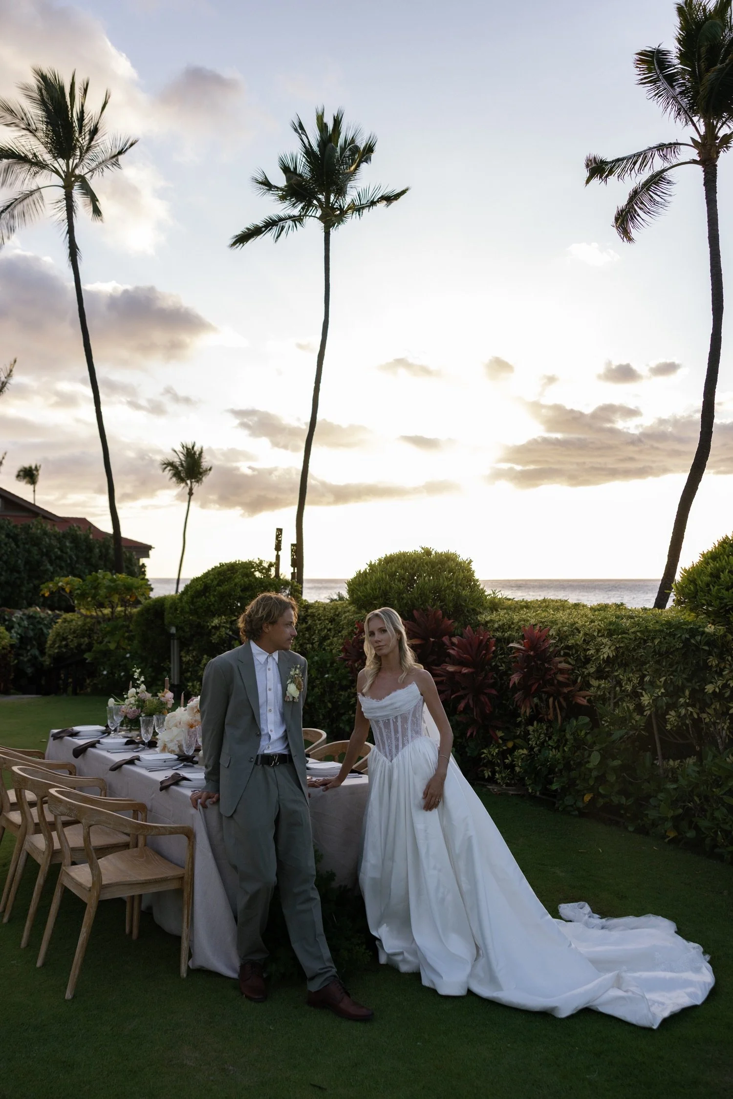 While the magic of the Four Seasons Resort Maui at Wailea as a wedding venue can’t be understated, a crucial part of any wedding day here is the vendor team put together by the couple. This team of wedding professionals will help to further elevate the already gorgeous space, provide the couple with their distinct wedding style, cater delicious sweets for the evening, and SO much more! Take the dresses from Floure Studio and Georgia Hardinge seen in this editorial shoot as an example. Sara’s strapless, princess styled first dress fit perfectly for the romantic feel of the day, while her ruching styled reception dress was an ideal choice for a late night of celebration!