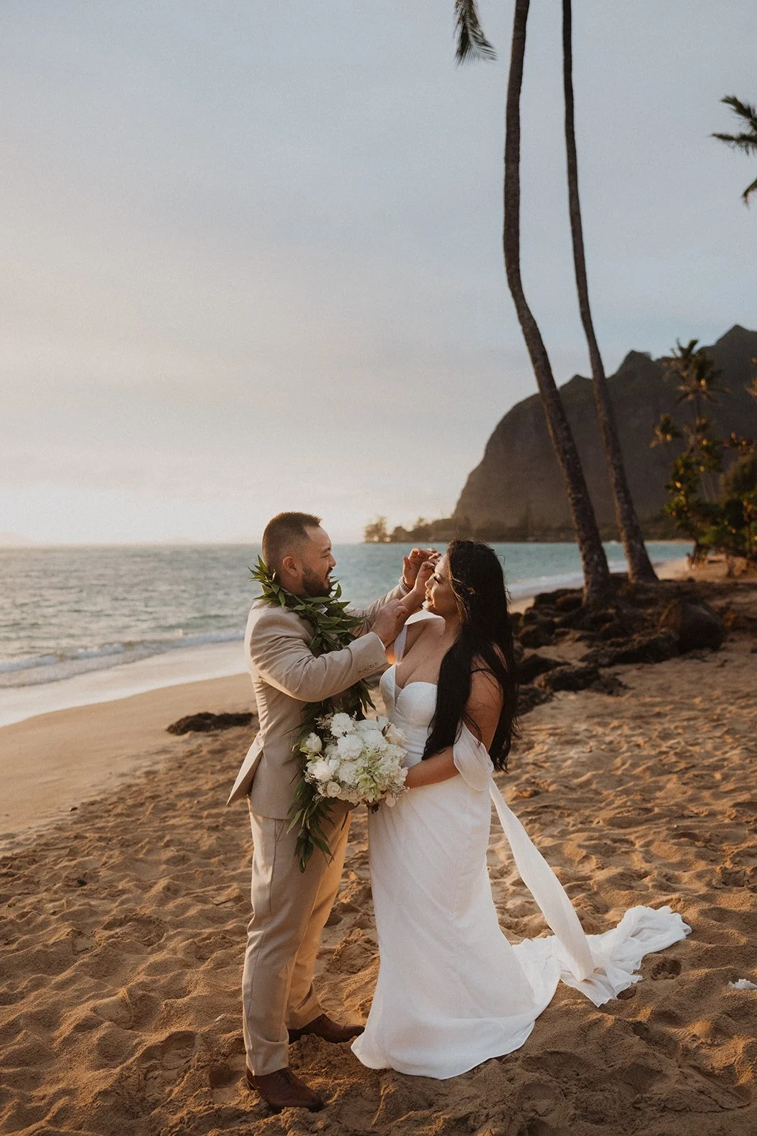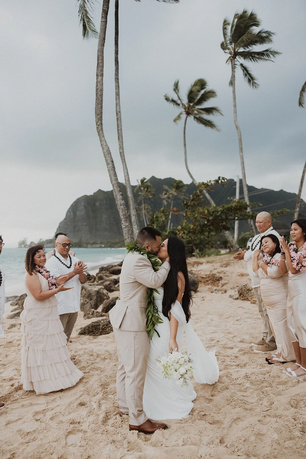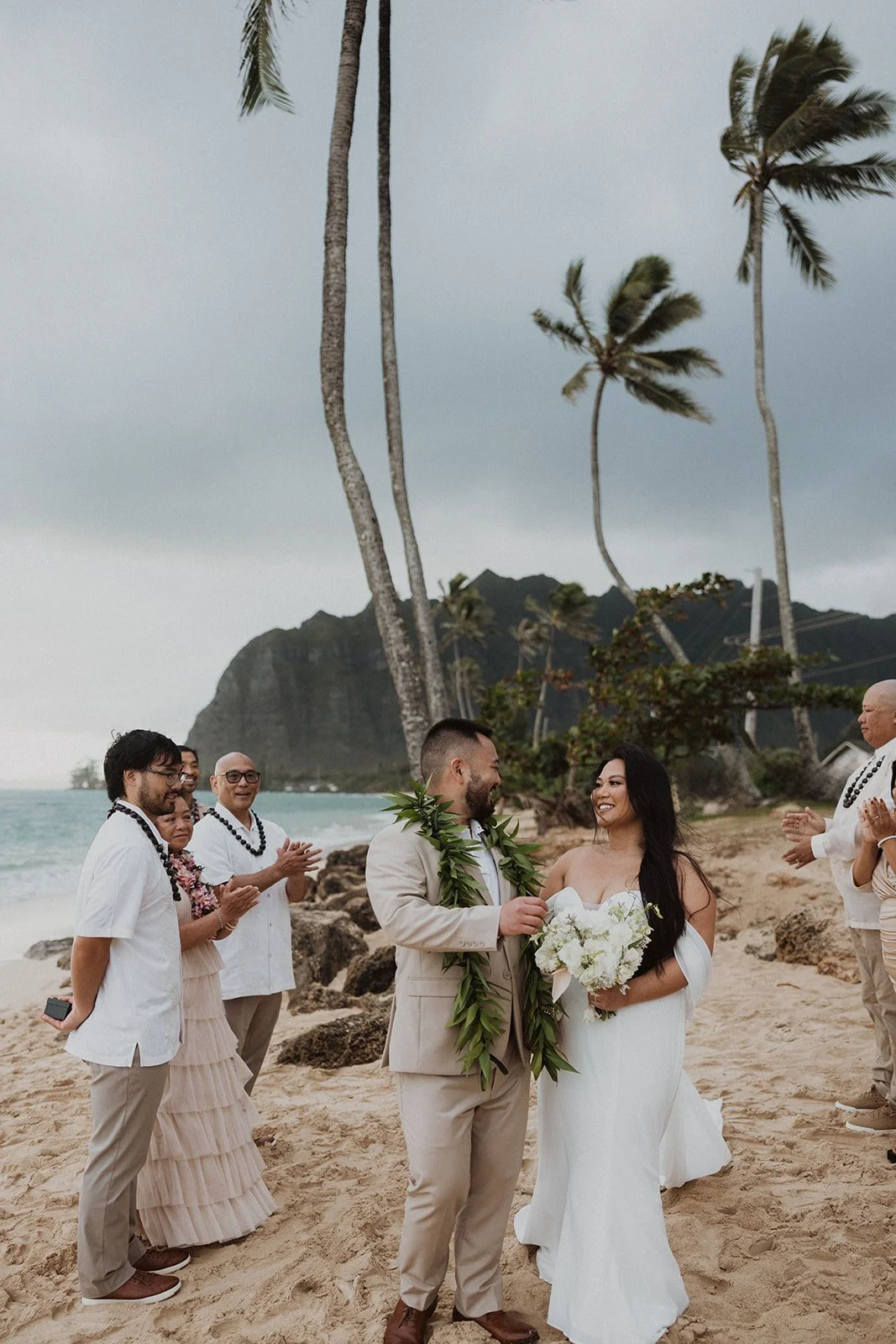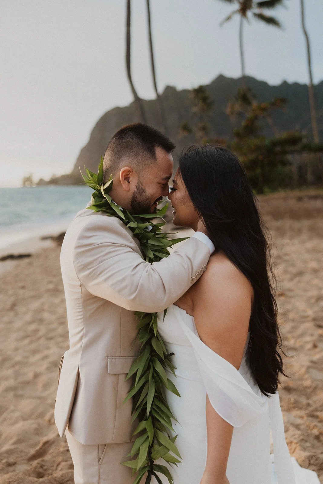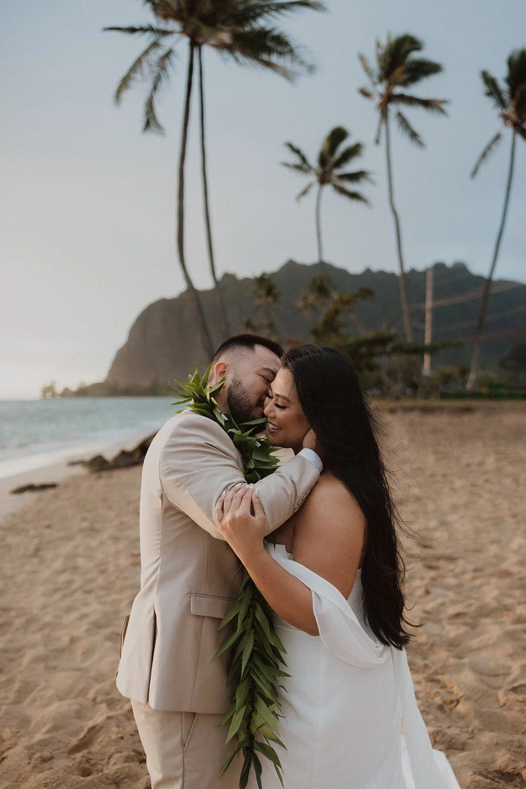 As the first light of dawn broke over the serene shores of Oahu, a couple stood hand in hand, surrounded by their closest family members, ready to elope in an intimate and meaningful ceremony. The soft hues of the sunrise painted the sky in warm shades of pink and gold, creating a breathtaking backdrop for their vows. With the gentle sound of waves crashing nearby, they exchanged promises of love and commitment, embracing the beauty of the moment. The simplicity of the celebration allowed for genuine connections, as laughter and heartfelt words filled the air, creating lasting memories against the spectacular island scenery. This intentional gathering honored not only their love but the support and presence of their immediate family, elevating the day to one filled with joy and togetherness.