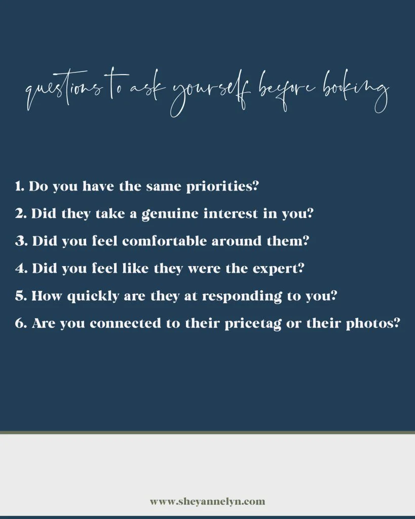 Now that you have talked with photographers and are narrowing down your decision, before booking it is so important you stop and ask yourself these questions so that you do not have buyers remorse. make sure that this decision is the right one for you and your fiance!